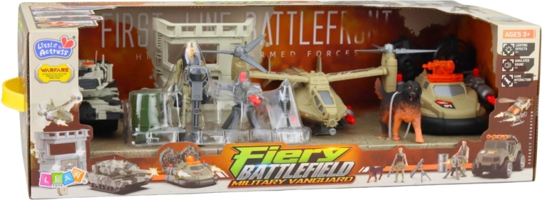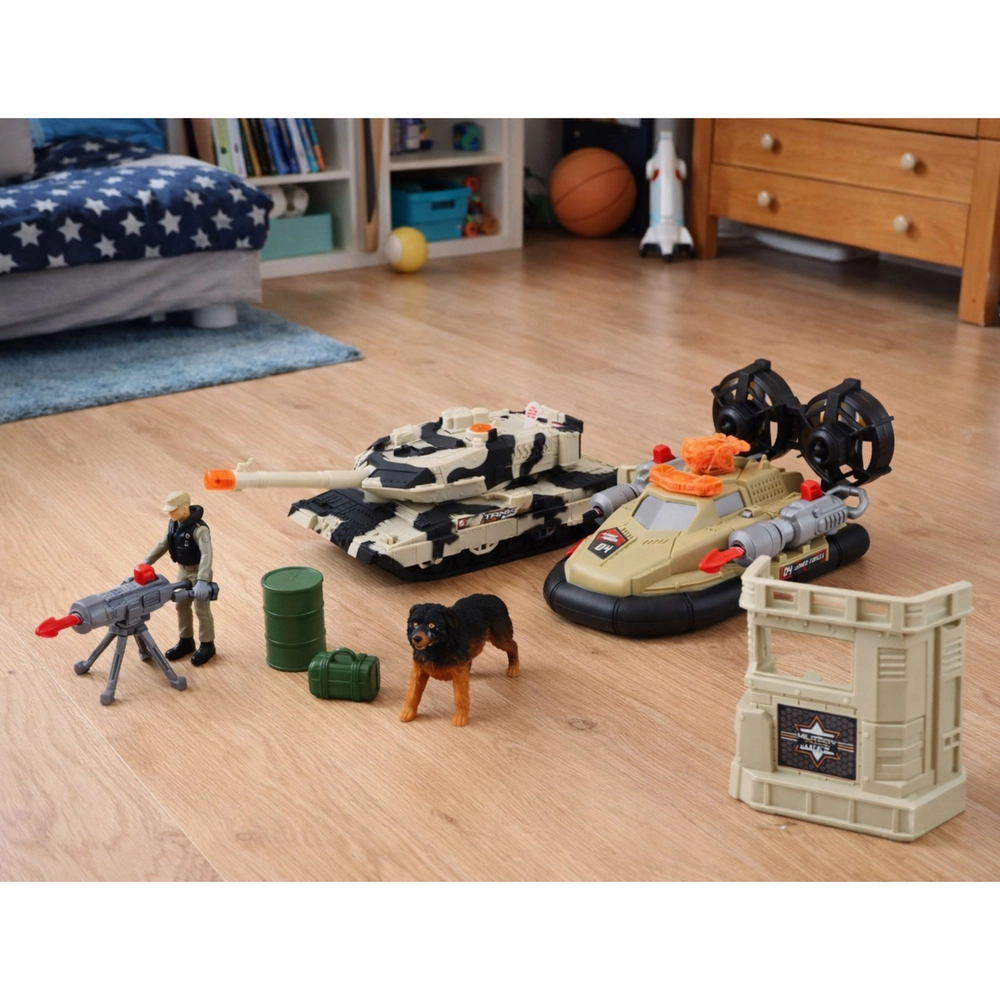 Dieses realistische Militär-Set vereint beliebte Armeefahrzeuge und Zubehör in einem actionreichen Paket. Kinder begeistern die Funktions-Effekte des Panzers (Licht und Sound), der drehbare Turm für eine schnelle Richtungsänderung des Angriffs sowie der Hubschrauber mit Raketenwerfer für Luftoperationen. Das Luftkissenboot meistert schnelle Verlegungen „zu Land und zu Wasser“ und ist ideal für Sondereinsätze.