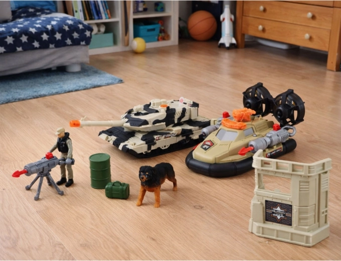 Luftkissenboot für schnelle Verlegungen, Basis-Posten, Soldat mit Maschinengewehr und treuer Diensthund – alles für spannende Szenarien.