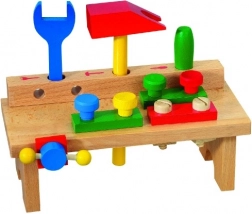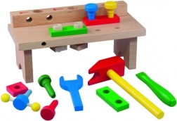 Das Set enthält alles Nötige für sicheres und unterhaltsames Spielen: Schraubendreher, Hammer, Schlüssel, Muttern und Schrauben. Alles ist aus hochwertigem Holz mit glatter Oberfläche gefertigt – angenehm und sicher in der Anwendung. Verpackt in einer Pappschachtel, auch als Geschenk geeignet.