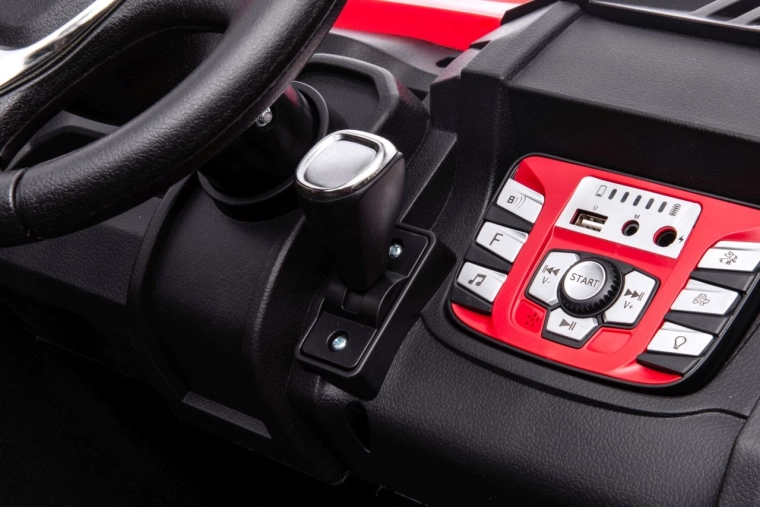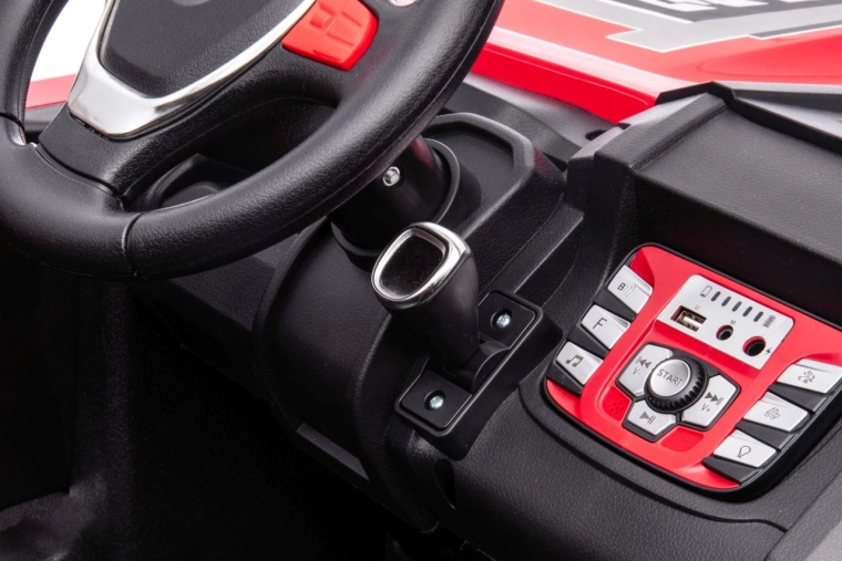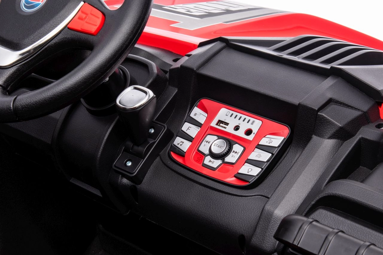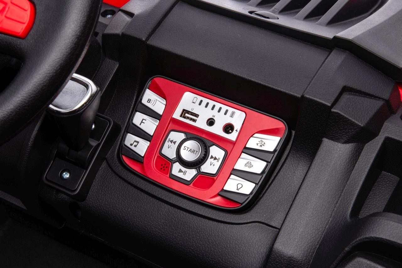 Für noch mehr Spaß sorgt das Multimedia-Panel: Bluetooth, USB, MP3, AUX, FM-Radio, integrierte Melodien und eine Hupe am Lenkrad. Praktisch ist auch die Ladezustandsanzeige. Die hohe Bodenfreiheit von 17 cm und die robuste Konstruktion meistern auch unbefestigte Untergründe.