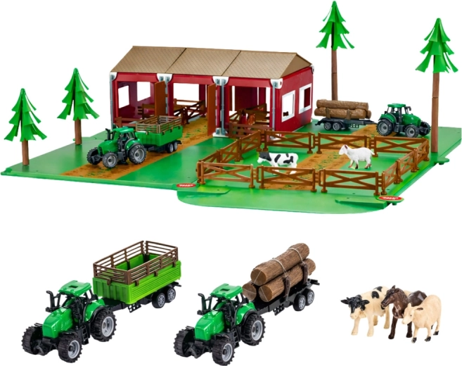 Zwei Traktoren und zwei Anhänger ermöglichen den Transport von Holz und weiterer Ladung und bilden die Arbeiten auf dem Hof realistisch nach. Die detaillierte Ausführung von Gebäuden, Zäunen und Traktorkabinen aus hochwertigem Kunststoff sorgt für Robustheit und eine ansprechende Optik.