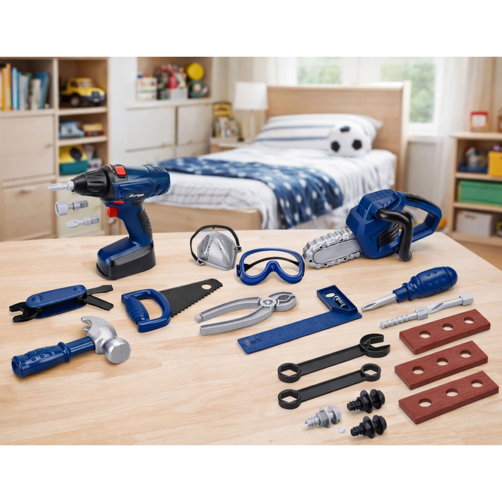 Akku-Schraubendreher, Säge, Hammer, Schlüssel und Schraubendreher sehen echt aus – sie fördern die Vorstellungskraft und das Lernen durch Spiel.