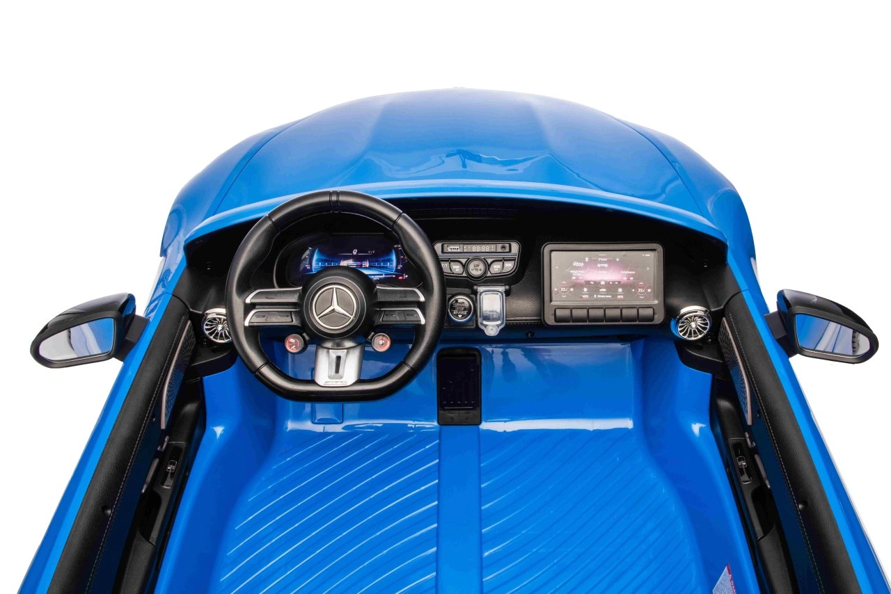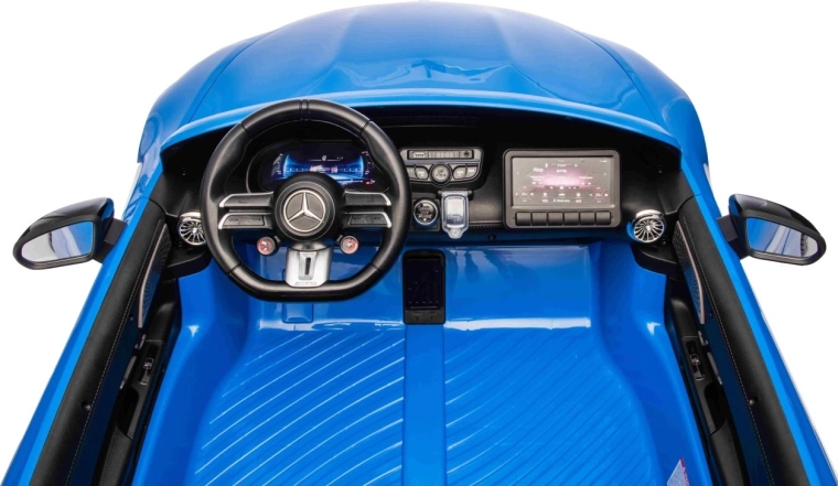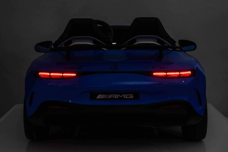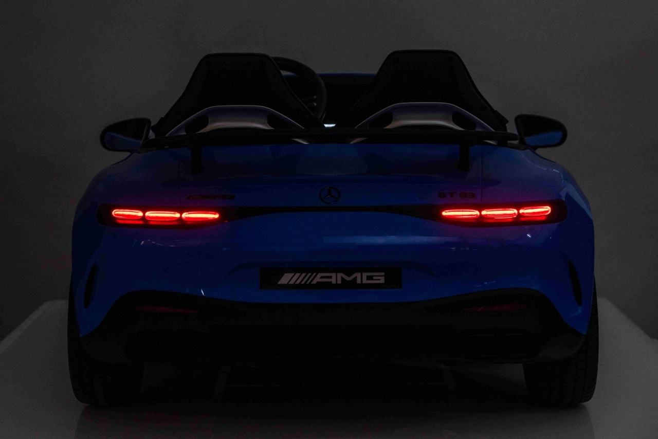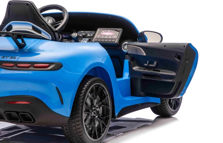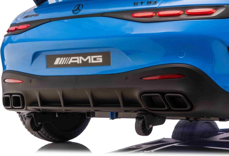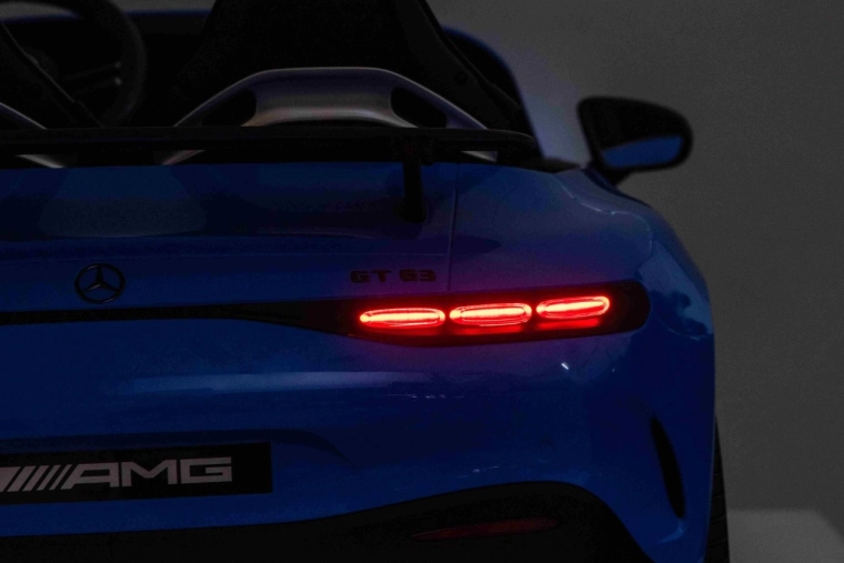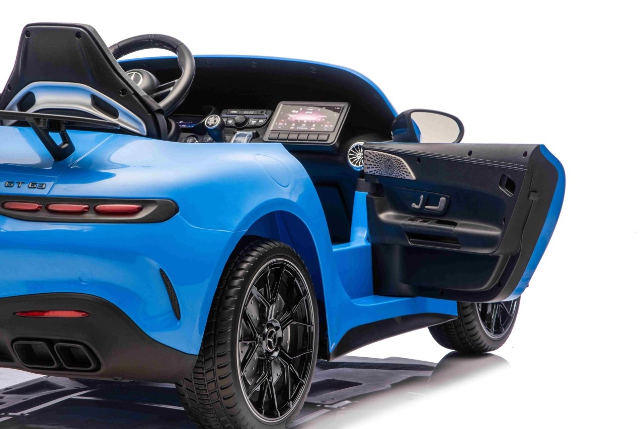 Ein Traum für kleine Fahrer: Das elektrische MERCEDES-BENZ GT 63 AMG Kinderauto in elegantem Blau vereint sportliches Design mit starker Leistung und Top-Ausstattung. Vier Motoren mit je 200 W und eine 24 V / 7 Ah Batterie sorgen für eine ruhige Fahrt, während die hintere Federung und die weichen EVA-Räder 27×9 cm Komfort auch auf unebenen Flächen bieten.