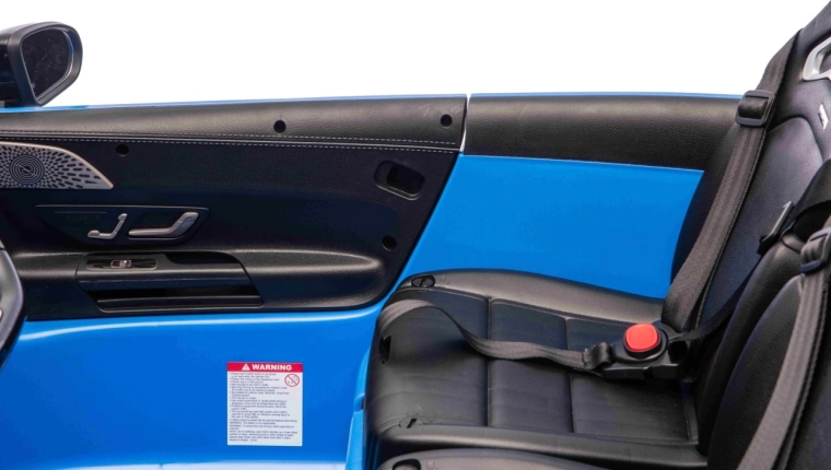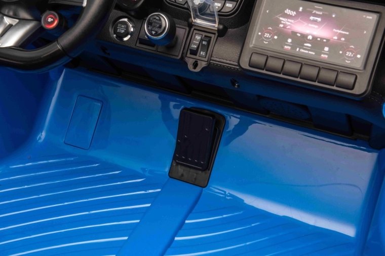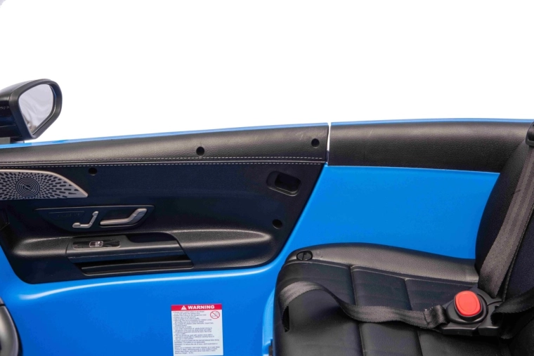 Der Innenraum begeistert mit zwei Sitzen aus Eco-Leder mit Sicherheitsgurten, einem realistischen Armaturenbrett und einem Multimedia-Panel mit MP3, USB, Bluetooth, AUX und FM-Radio. Dank öffnender Türen, LED-Lichtern vorn und hinten und der Soft-Start-Funktion ist die Fahrt sicher und maximal realistisch. Eltern behalten mit der 2,4-GHz-Fernbedienung mit drei Geschwindigkeiten und Not-STOP stets die Kontrolle.