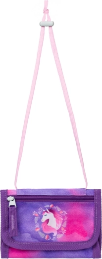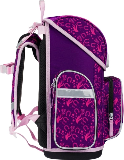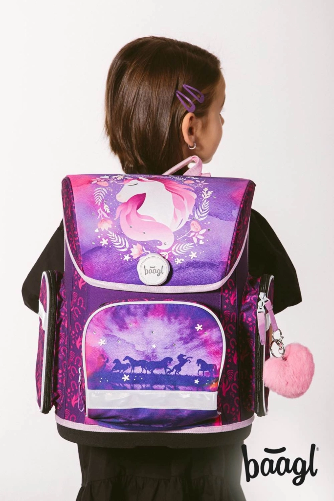 Komplette Schulausstattung für kleine Schulkinder mit dem Motiv Pferd in zauberhaften lila-rosafarbenen Tönen. Das Set enthält eine ergonomische Schultasche mit verstellbarem Rückensystem, einen leichten Schuhbeutel, ein Federmäppchen mit zwei Klappen, eine abwaschbare Schürze und eine Halsgeldbörse. Für Sicherheit sorgen reflektierende Elemente, für Komfort ein atmungsaktives Rückenpolster und für einfaches Handling der magnetische Fidlock-Verschluss.