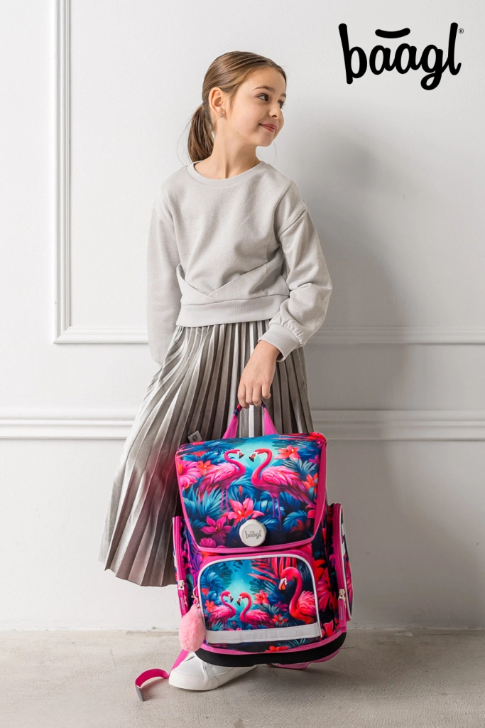 Schulset BAAGL Ergo Flamingos – Schultasche, Federmäppchen, Beutel, Schürze und Geldbörse