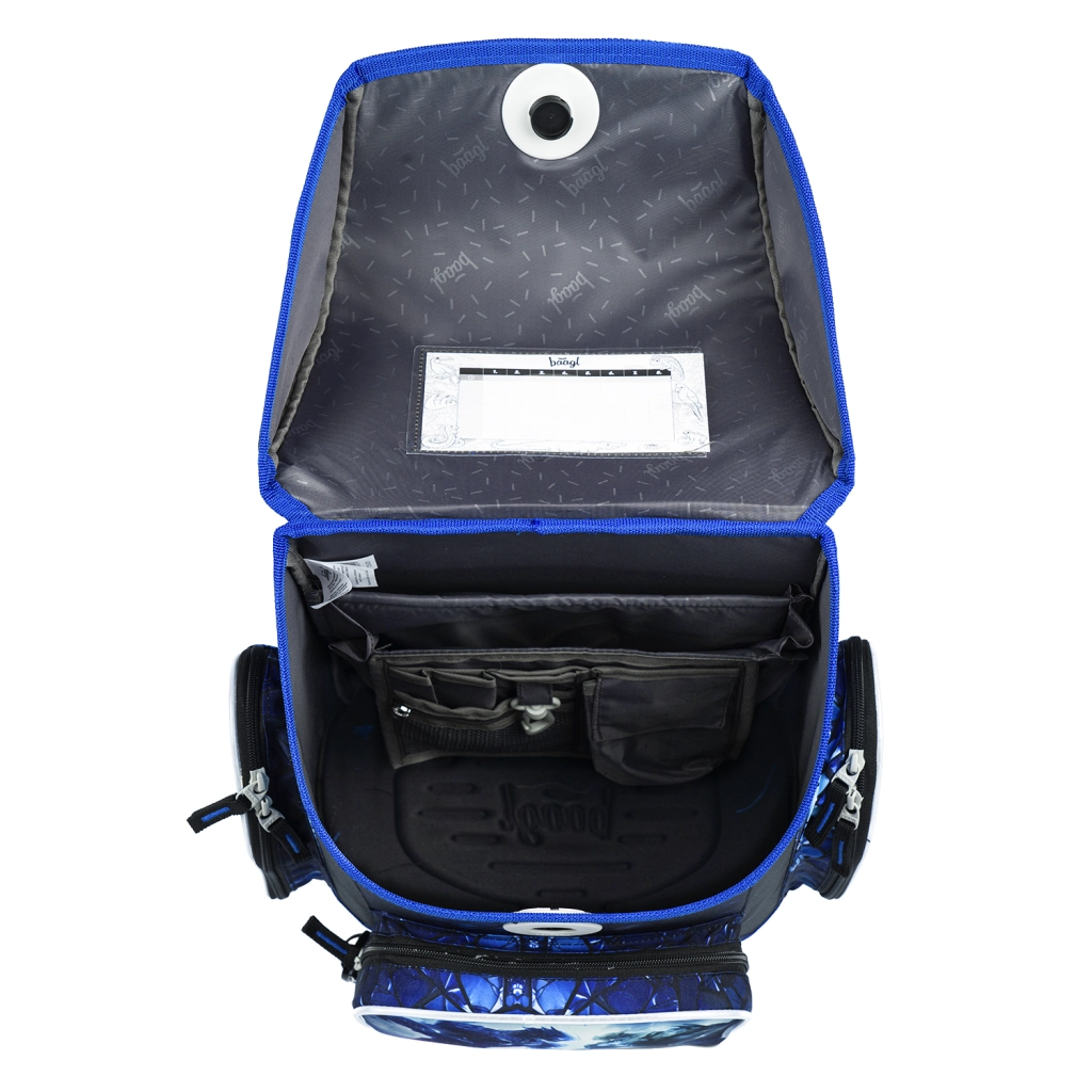 Die praktische Innenaufteilung mit Organizer, transparenter Stundenplan-Tasche, isolierter Fronttasche und zwei Seitentaschen sorgt für Ordnung. Ergänzt wird das Set durch ein einlagiges Federmäppchen (ohne Inhalt) mit YKK-Reißverschluss, einen robusten Beutel mit Kordelzug für den Rücken und Karabiner zum Befestigen am Ranzen, eine abwischbare Kinderschürze mit zwei Taschen und eine Halsgeldbörse mit Namensfeld und Sicherheitsverschluss an der Kordel.