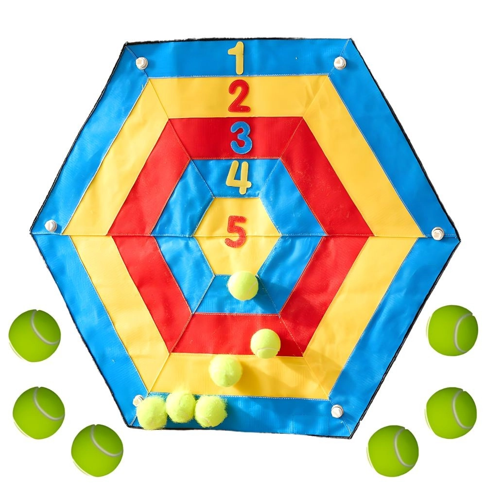 Verwandeln Sie Rechnen in ein actionreiches Abenteuer. Die große sechseckige Zielmatte mit Aufhängeösen ist für ein sicheres, fesselndes Spiel konzipiert: Kinder werfen weiche Klettbälle auf nummerierte Felder und sammeln Punkte. Die leichte Konstruktion ermöglicht schnelles Aufhängen an Wand oder Tafel und den Einsatz im Freien.