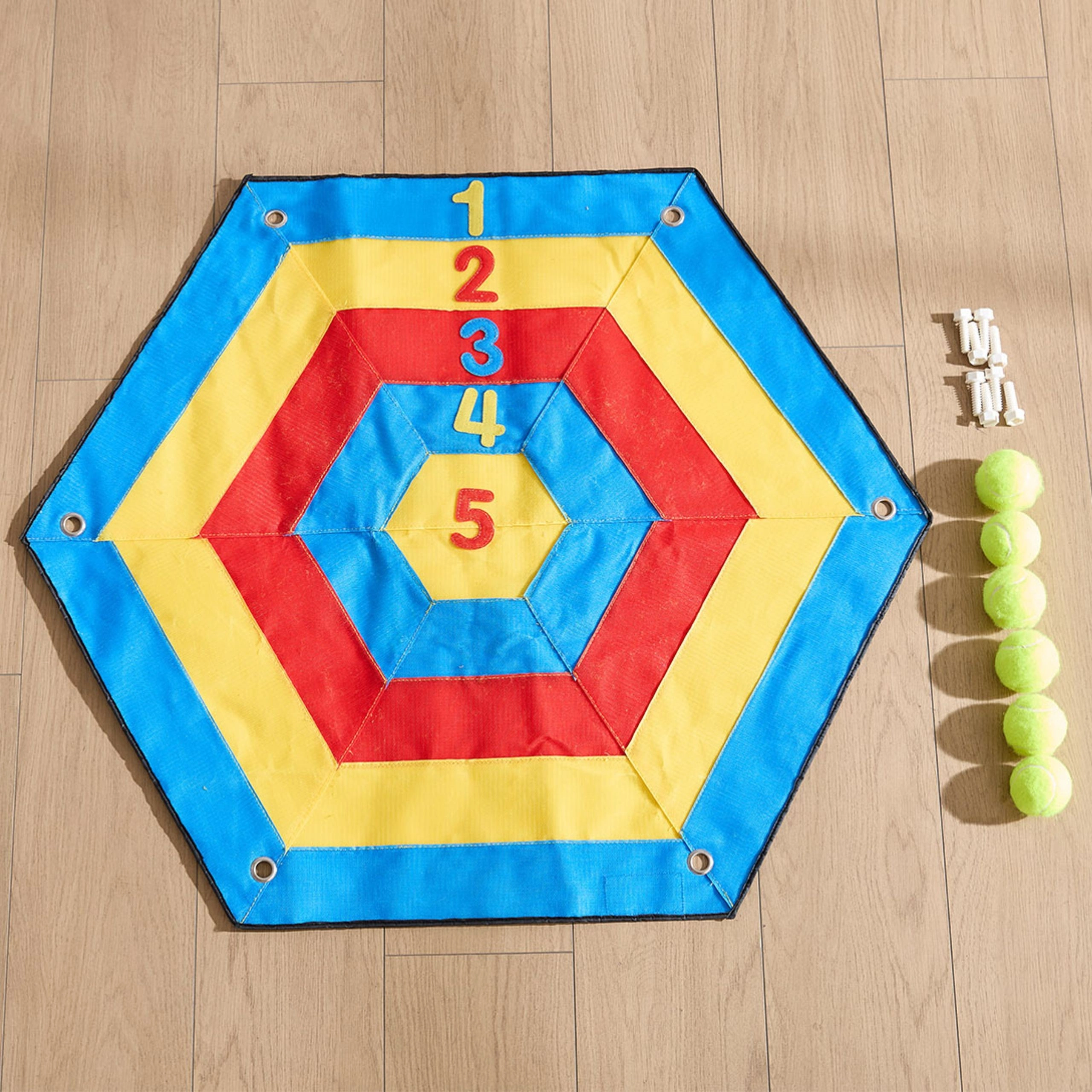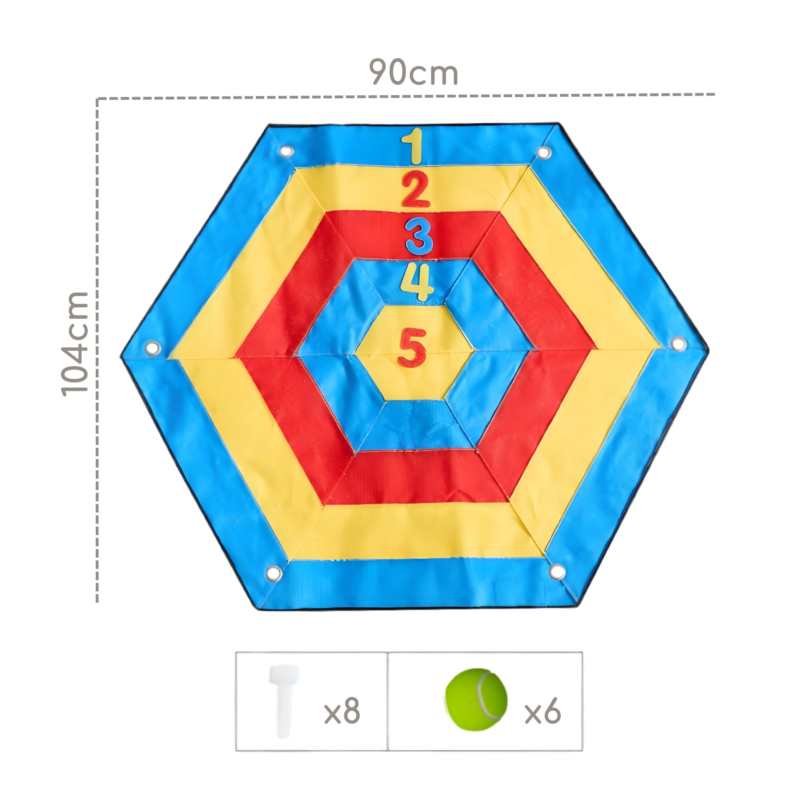 Die sechseckige Zielscheibe mit kräftigen Farben und nummerierten Feldern lädt zum Spielen ein und fördert Genauigkeit und Konzentration.