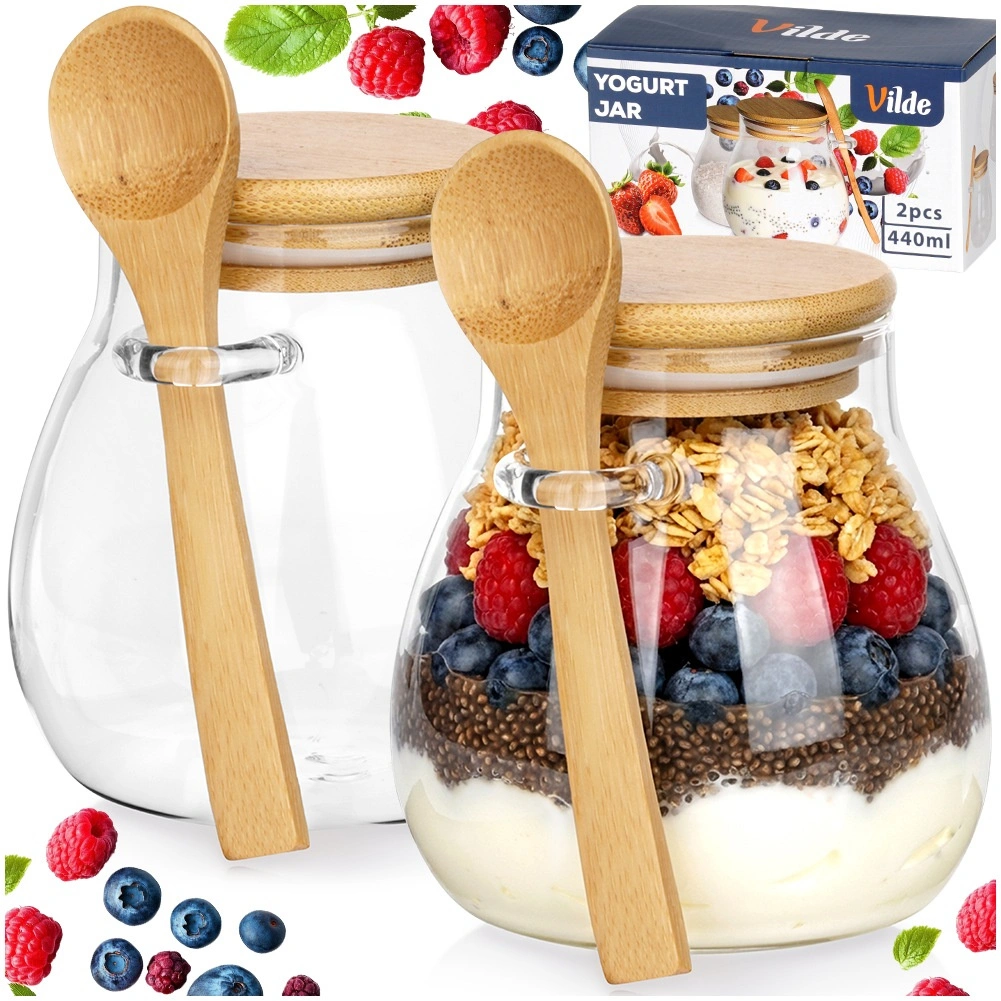 Zwei Glasbecher à 440 ml mit Bambusdeckeln und Löffeln – ideal zum Servieren und Aufbewahren von Desserts und Snacks zu Hause und unterwegs.