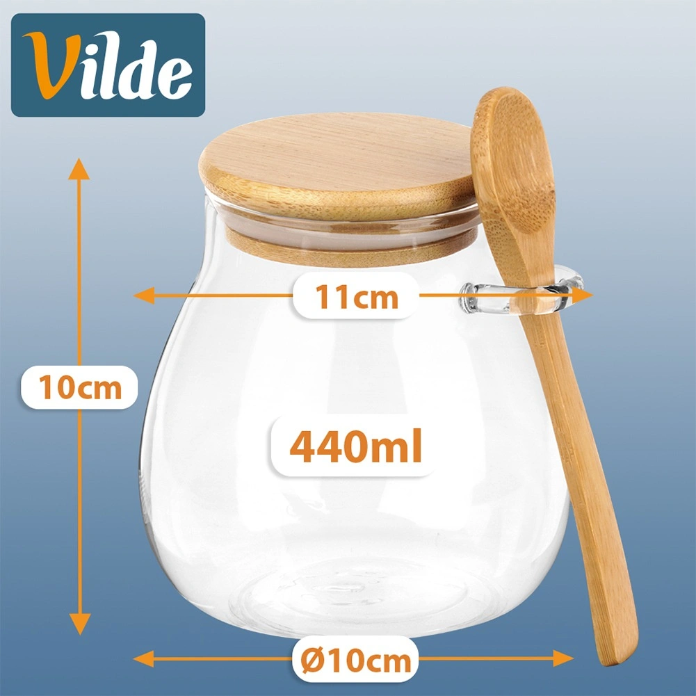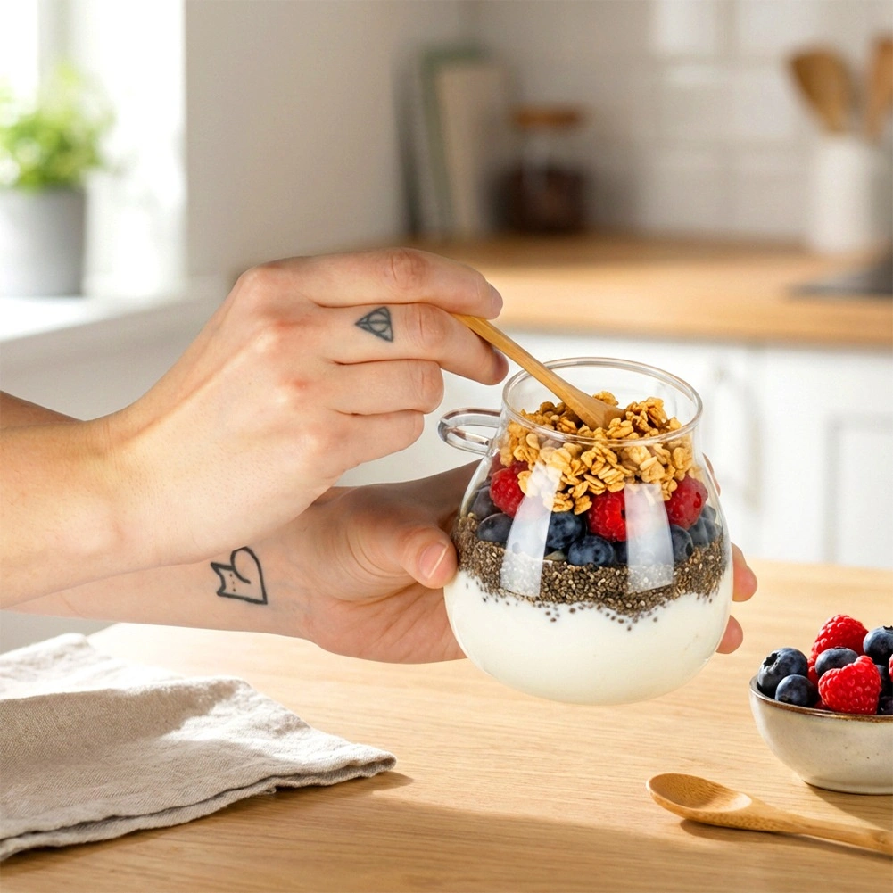 Entdecken Sie stilvolle und praktische Becher, die Ihre selbstgemachten Joghurts, Chia-Puddings und Schichtdesserts perfekt in Szene setzen. Klarglas präsentiert den Inhalt attraktiv, während der Bambusdeckel mit Dichtung vor Austrocknen und Geruchsaufnahme schützt. Der integrierte Halter an der Seite hält den Löffel stets bereit zum Servieren.
