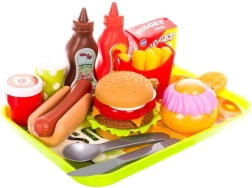 Komplette „Fast-Food“-Ausrüstung inklusive Burger, Hotdog, Pommes, Getränk und Desserts. Kinder stellen ihr eigenes Menü zusammen und trainieren ihre Fantasie.