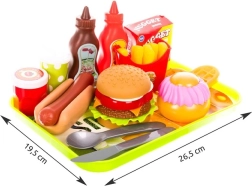 Lustiges Set für kleine Köche mit bis zu 26 farbigen Teilen zum Fast-Food-Spielen. Enthält Tablett, Hamburger, Hotdog, Pommes, Waffel, Getränke und Saucen. Fördert Fantasie, Feinmotorik und das gemeinsame Spiel mit den Eltern.