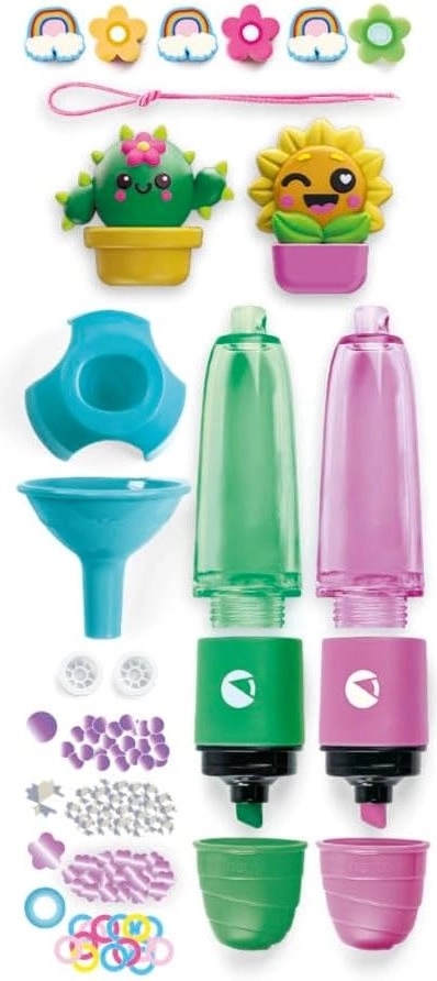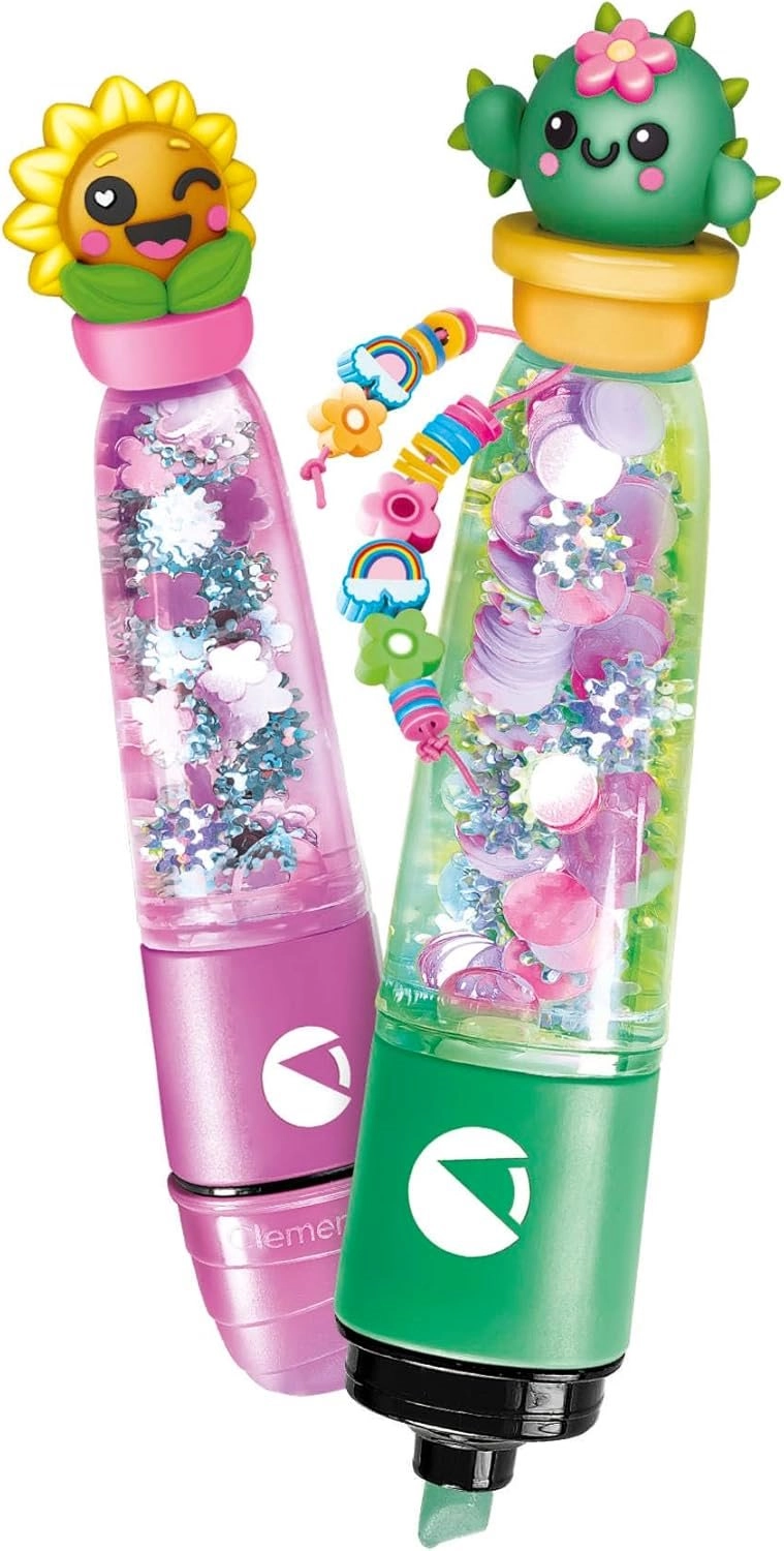 Mit diesem Set gestalten Kinder zwei einzigartige Textmarker und verzieren deren transparente Gehäuse mit Glitzer, Perlen und schwimmenden Deko-Elementen. Niedliche Toppers in Form von Kaktus und Sonnenblume machen jedes Schreiben zum Spiel und das Markieren zu einem stylischen Spaß.