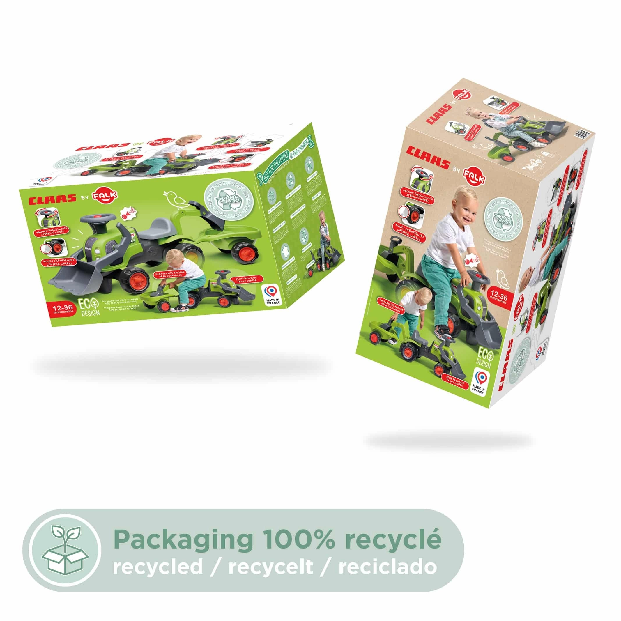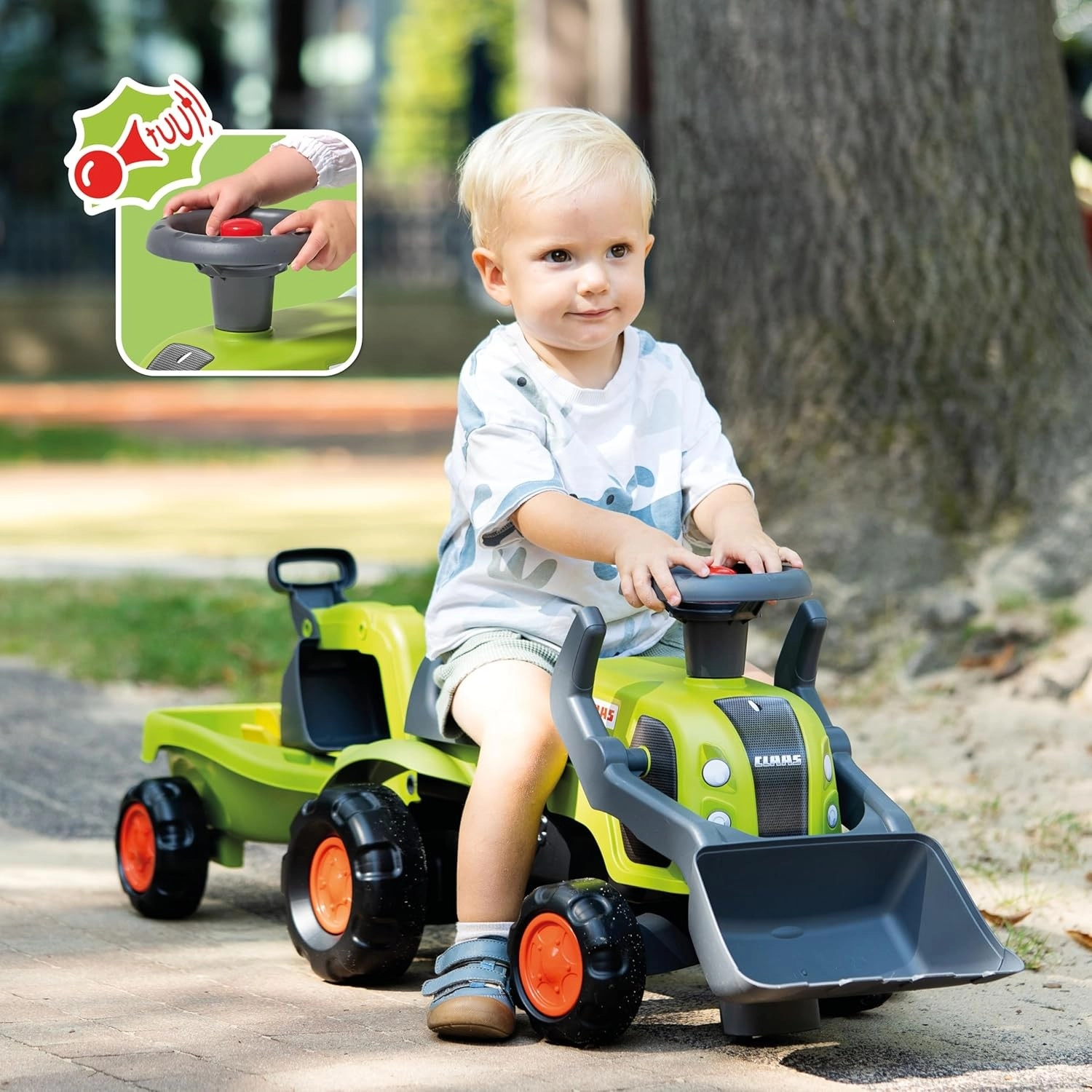 Im Lieferumfang enthalten sind der lizenzierte CLAAS-Rutscher-Traktor, ein abnehmbarer Anhänger, eine Frontschaufel, ein Heckbaggerarm und ein Lenkrad mit Hupe – einsatzbereit für jede „Baustelle“.