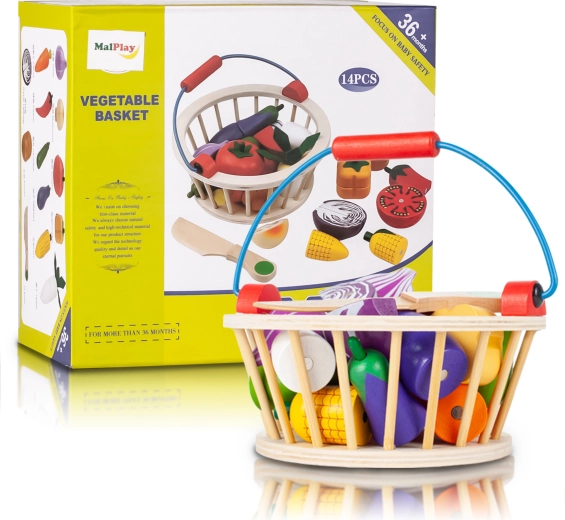 Dieses hochwertige Holzset fördert Fantasie sowie Hand-Auge-Koordination. Kinder können das Gemüse „schneiden“ und dank der versteckten Magnete immer wieder zusammensetzen – ein spielerisches und sicheres Zubehör für die Kinderküche. Der praktische Korb mit Henkel erleichtert Aufbewahrung und Transport.
