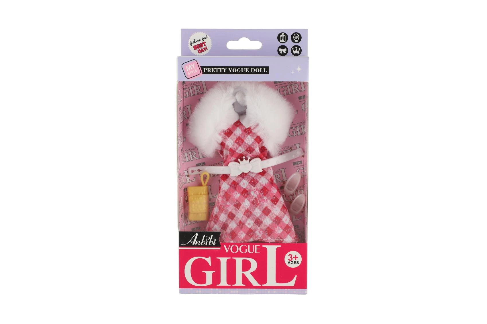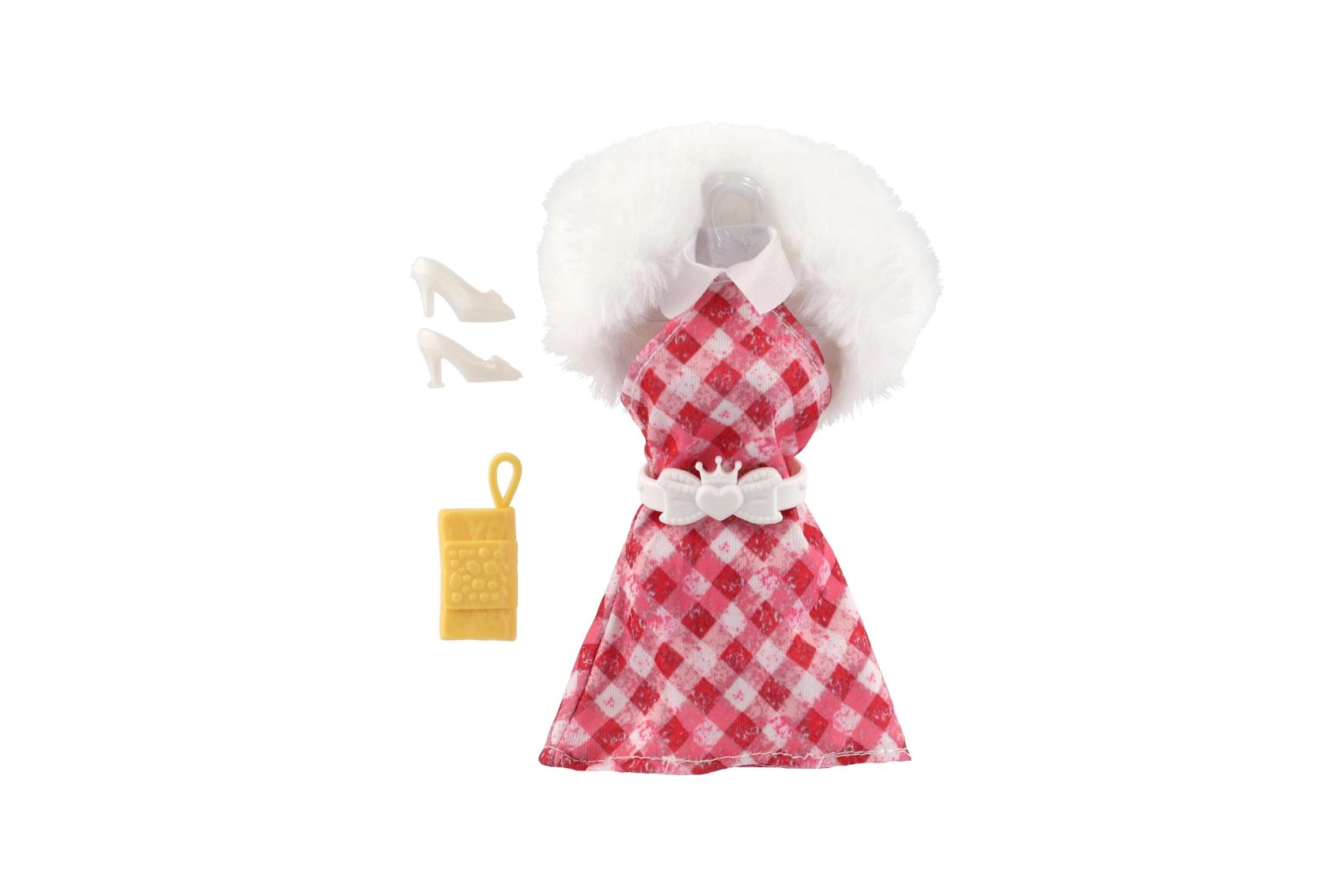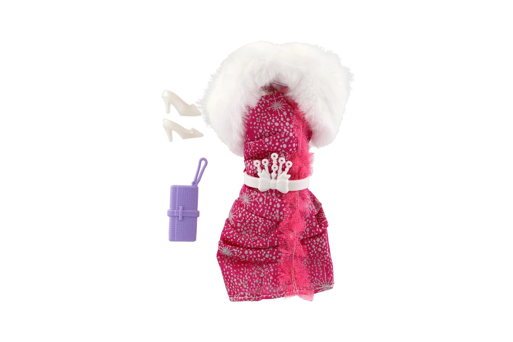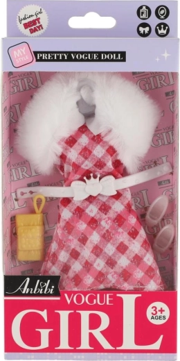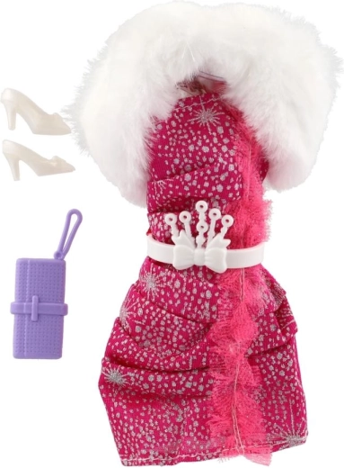 Rosafarbene, gemusterte und karierte Kleider mit weißem Kunstpelzkragen wirken luxuriös und verleihen der Puppe einen festlichen Look.