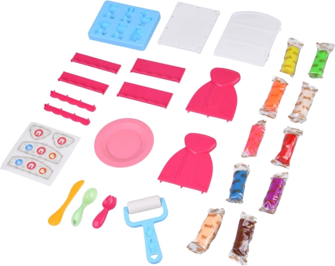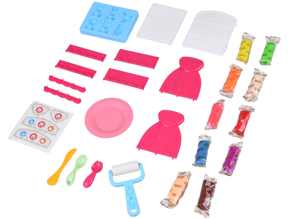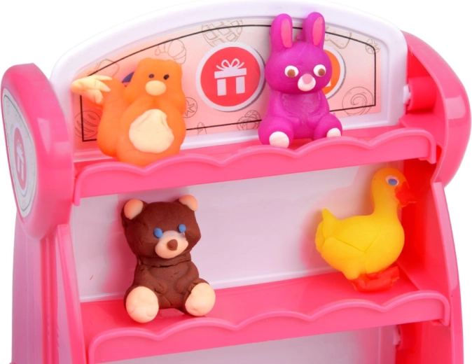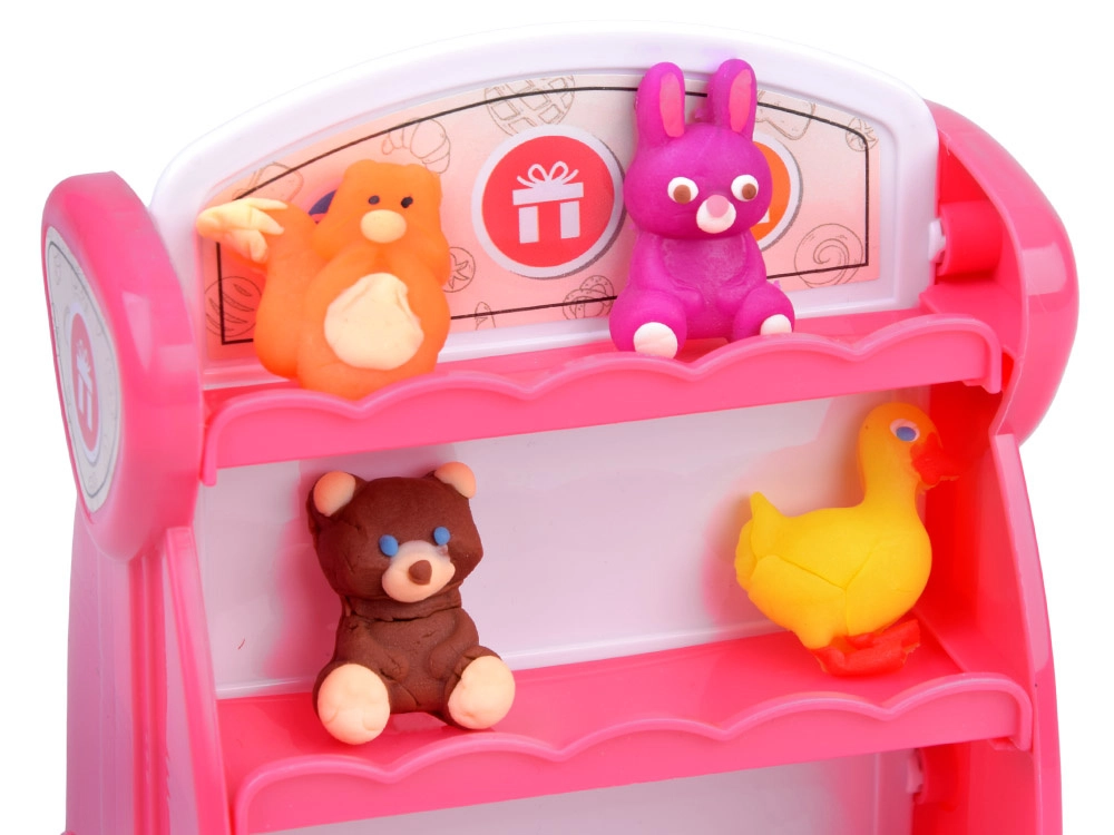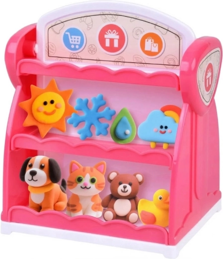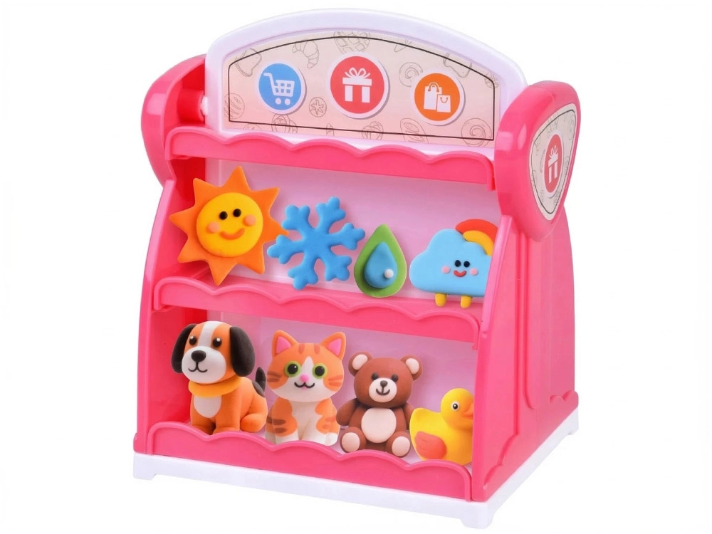 Dieses umfangreiche Knetset verwandelt das Kinderzimmer in einen kleinen Ausstellungs-Shop. Weiche, formbare Knete in 10 Farben lässt sich leicht verarbeiten, während die Formen im Nu niedliche Tier- und „Wetter“-Motive entstehen lassen. Fertige Werke werden stolz auf dem beidseitigen rosa Regal mit Ablagen präsentiert.