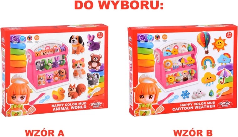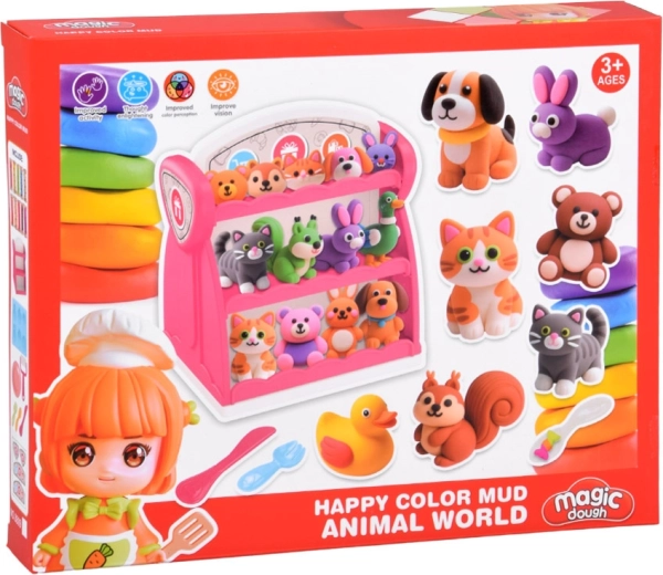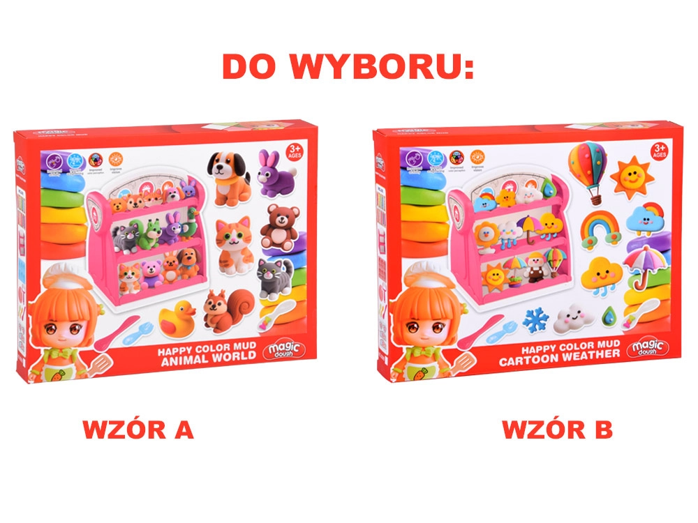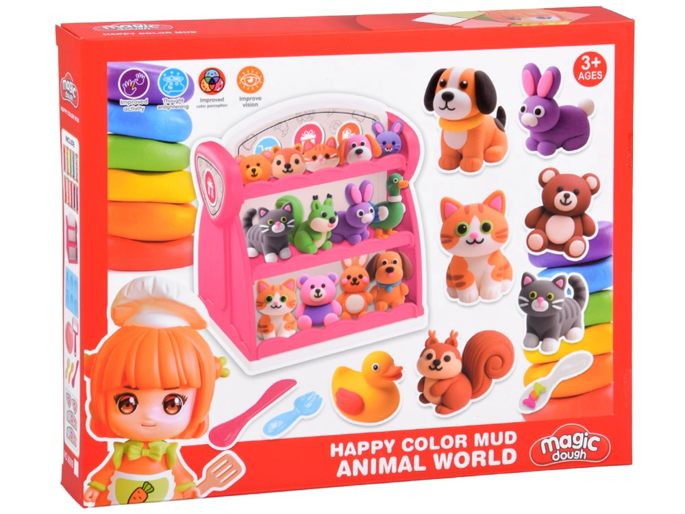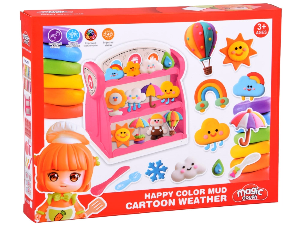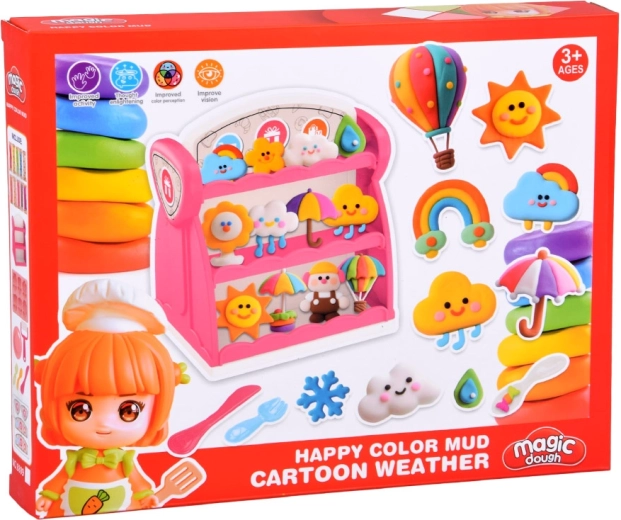 Dieses umfangreiche Knetset verwandelt das Kinderzimmer in einen kleinen Ausstellungs-Shop. Weiche, formbare Knete in 10 Farben lässt sich leicht verarbeiten, während die Formen im Nu niedliche Tier- und „Wetter“-Motive entstehen lassen. Fertige Werke werden stolz auf dem beidseitigen rosa Regal mit Ablagen präsentiert.