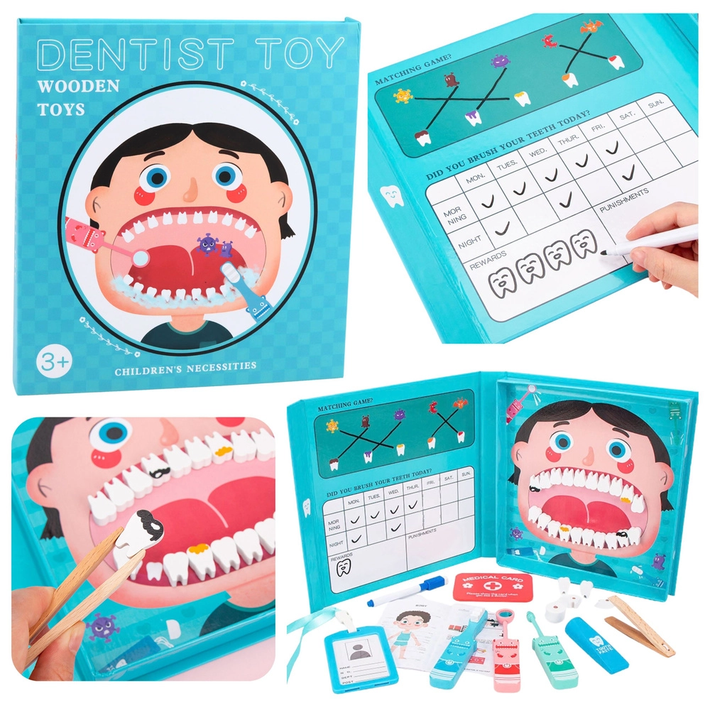 Das magnetische Holzbuch mit zahnmedizinischem Thema ist ein großartiges Lernspielzeug, das Kindern spielerisch richtige Gewohnheiten vermittelt – vom Zähneputzen bis zur Kontrolle und Behandlung. Auf der magnetischen Fläche mit der Darstellung eines Mundes können sie Zähne platzieren, ihren Zustand untersuchen und die beiliegenden Instrumente wie ein echter Zahnarzt verwenden.