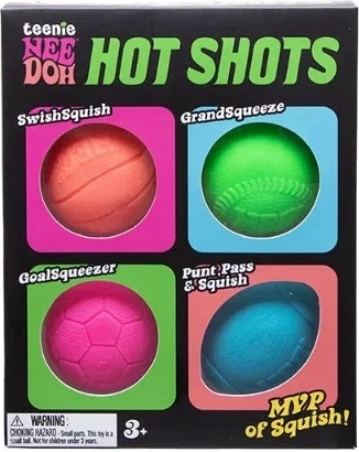 Die Anti-Stress-Bälle NeeDoh Hot Shots sind in sozialen Netzwerken beliebt und gehören zu den favorisierten sensorischen Spielzeugen für Kinder ab 3 Jahren. Jeder Ball hat eine andere Textur, lässt sich drücken, dehnen und werfen und das Material nimmt stets seine ursprüngliche Form wieder an. Perfekt zum Abschalten, zur Steigerung der Aufmerksamkeit und zur Beruhigung im Alltag.