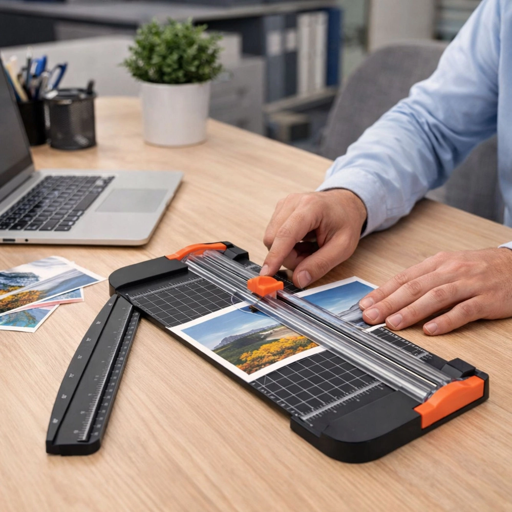Der abgedeckte Schlitten mit scharfer SK5-Stahlklinge ermöglicht flüssiges und sicheres Schneiden ohne Fingerkontakt mit der Klinge. Ideal für Büro, Schule und Heimwerkstatt.