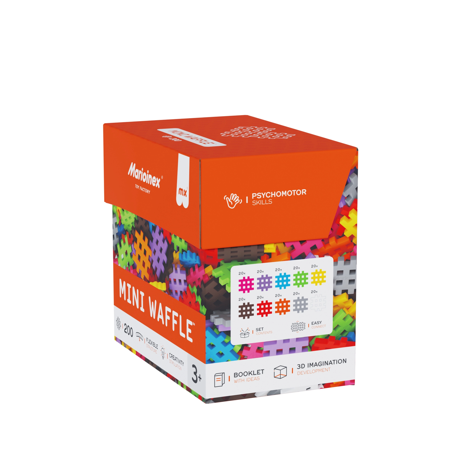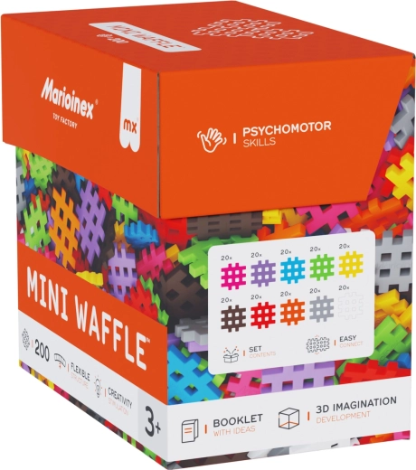 Das Marioinex Mini Waffle Bauset bietet vielfältige Gestaltungsmöglichkeiten – von einfachen Objekten bis hin zu ausgearbeiteten 3D-Bauten. Die Teile haben eine weiche, angenehme Struktur und lassen sich leicht verbinden und trennen, was spielerisches Lernen, Konzentration und Geduld unterstützt. Durch ihre einzigartige Form liegen sie ideal in Kinderhänden und fördern das eigenständige Spiel.