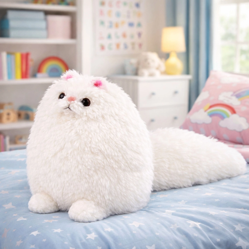 Diese weiße Plüschkatze besticht durch ihre runde, flauschige Form und den außergewöhnlich langen Schwanz, der dem Spielzeug einen besonderen Charme verleiht. Der samtige Plüsch lädt zum Umarmen ein und bietet maximalen Komfort beim Schlafen und Entspannen.