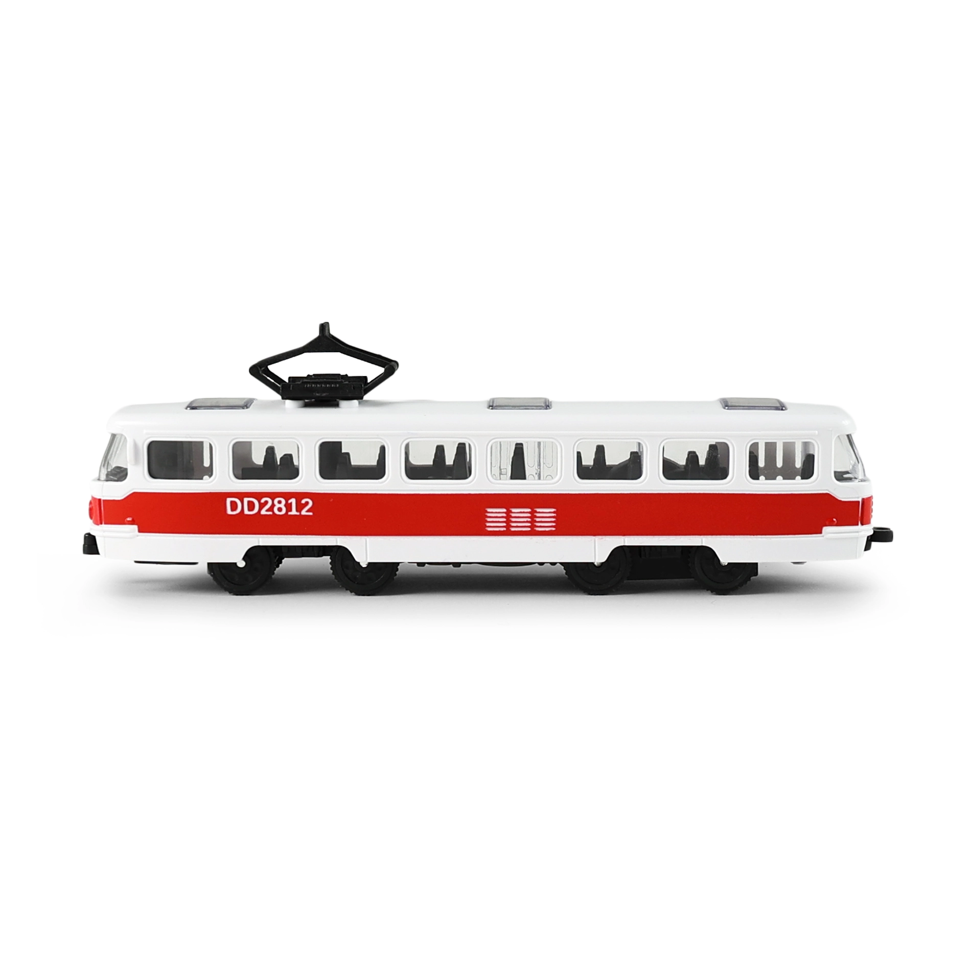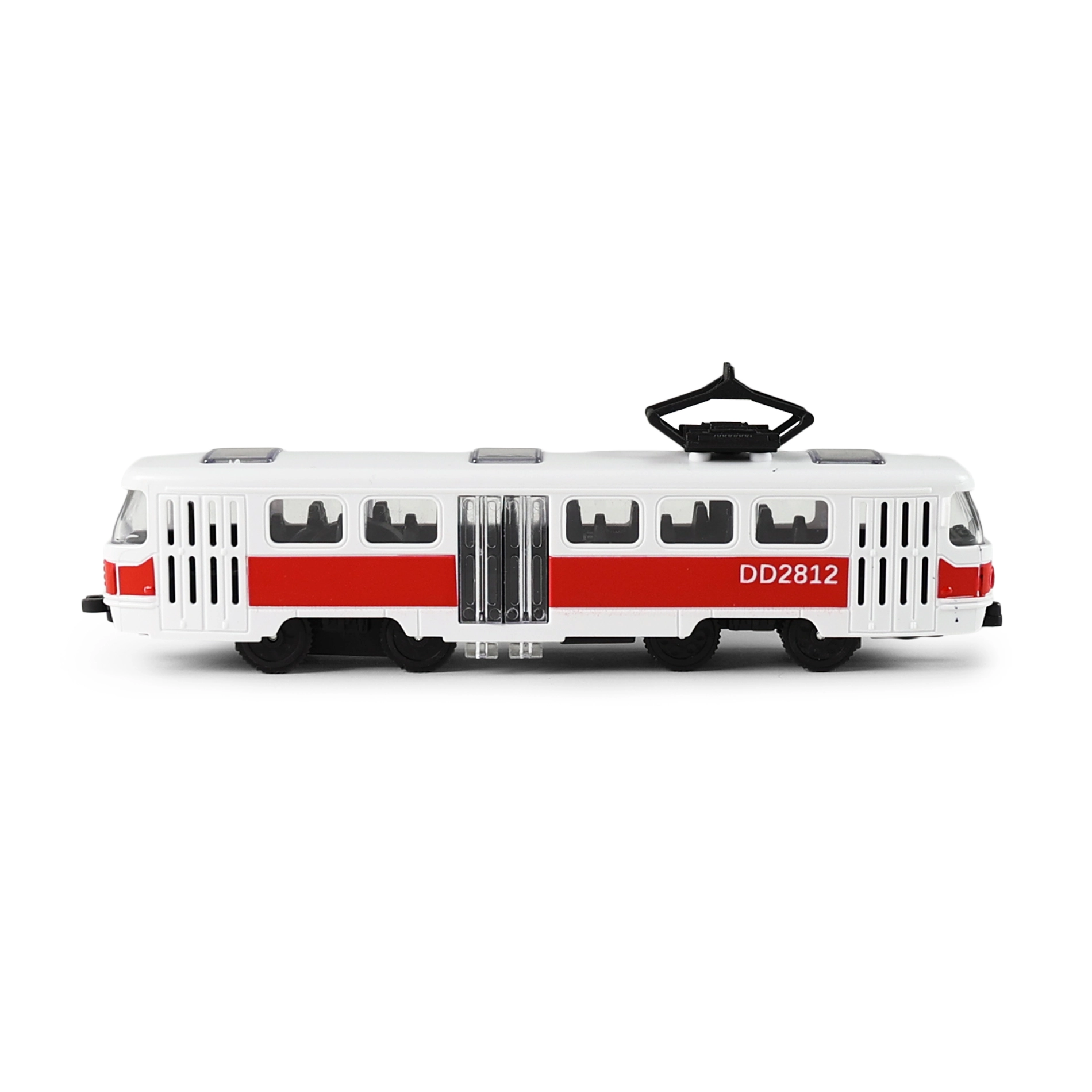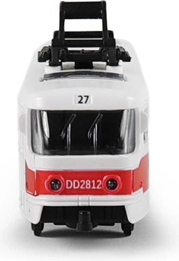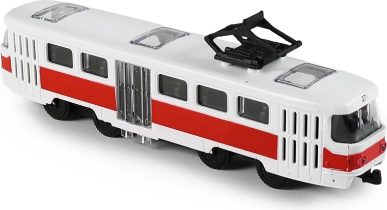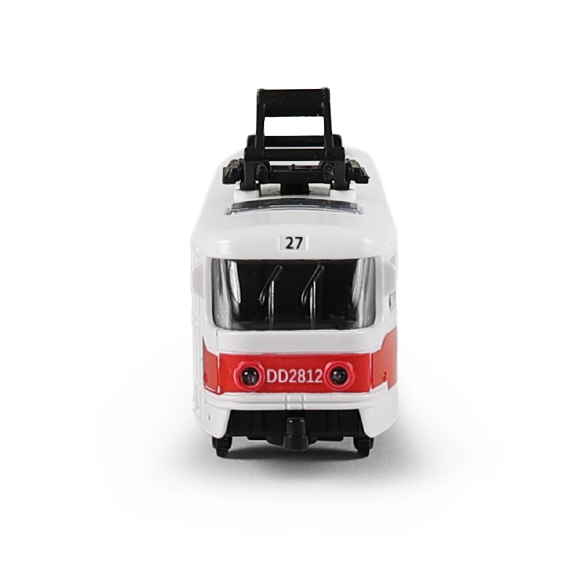 Realistische rot-weiße Straßenbahn mit detaillierter Ausarbeitung von Fenstern, Türen und Dachstromabnehmer – eine großartige Ergänzung für den kindlichen Fuhrpark. Dank der kompakten Länge von 16 cm liegt sie gut in kleinen Händen und ist ideal für zu Hause wie auch für unterwegs.