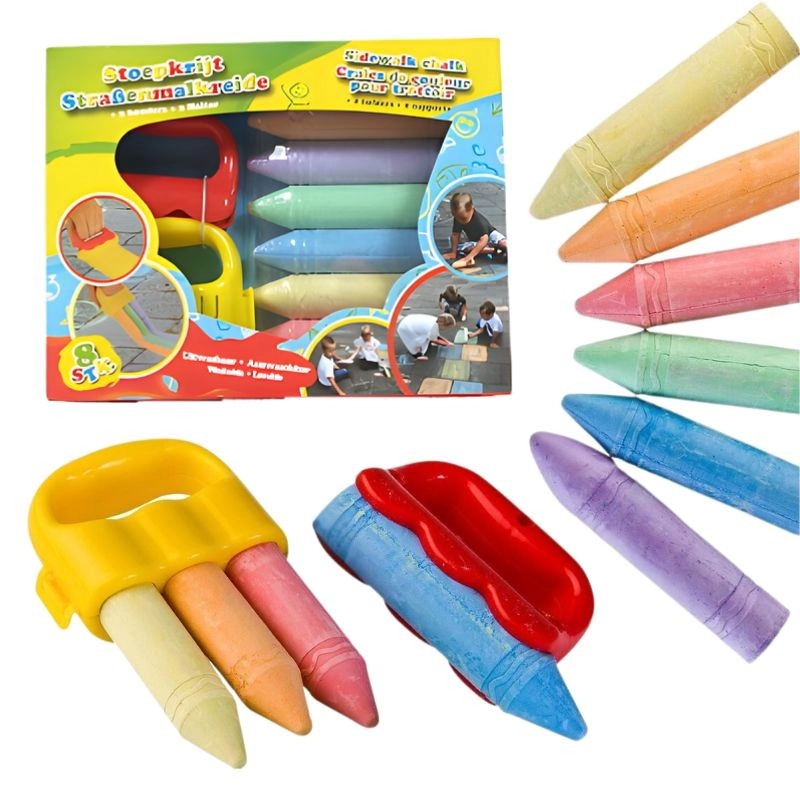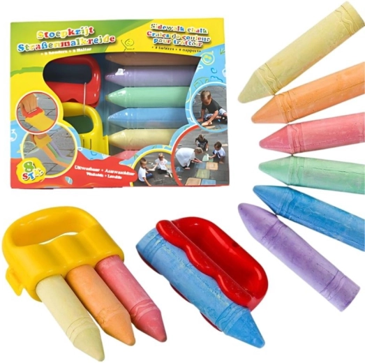 Entdecken Sie die Freude am kreativen Gestalten im Freien mit bunten Kreiden, die dank zwei praktischer Halter perfekt in Kinderhände passen. Die Halter erleichtern die Handhabung, erhöhen den Komfort beim Zeichnen und halten zugleich die Hände sauber.