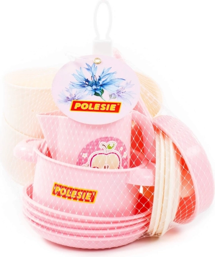 Dieses verspielte Set in sanften Pastellfarben bietet alles Nötige fürs kindliche Tischdecken: Tassen mit Untertassen, Teller, einen Topf mit Deckel, eine Pfanne mit Deckel, ein Kännchen, eine Schöpfkelle, Löffel und weiteres Zubehör. Dank des robusten und leichten Kunststoffs ist das Geschirr leicht zu handhaben und sicher für Kinderhände.