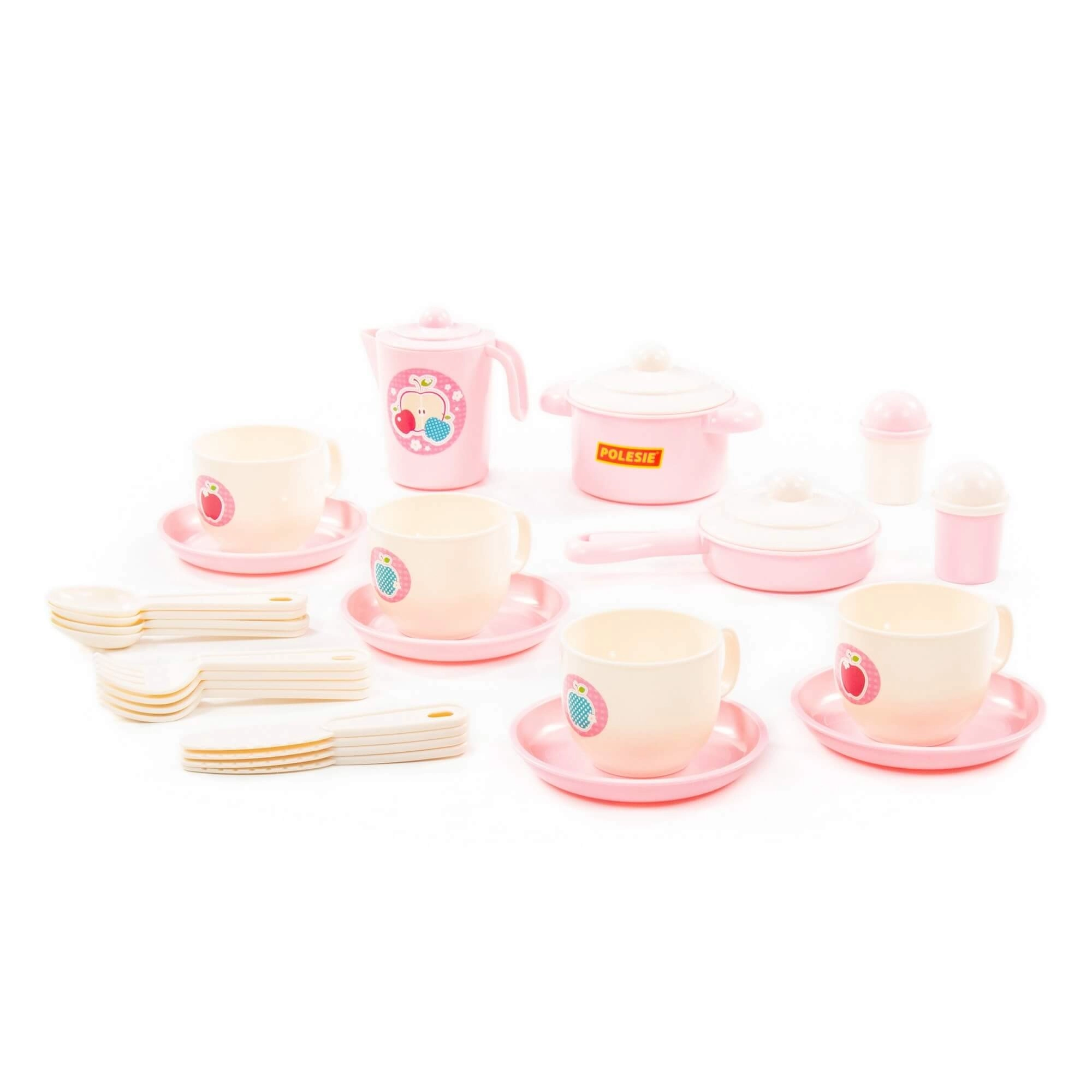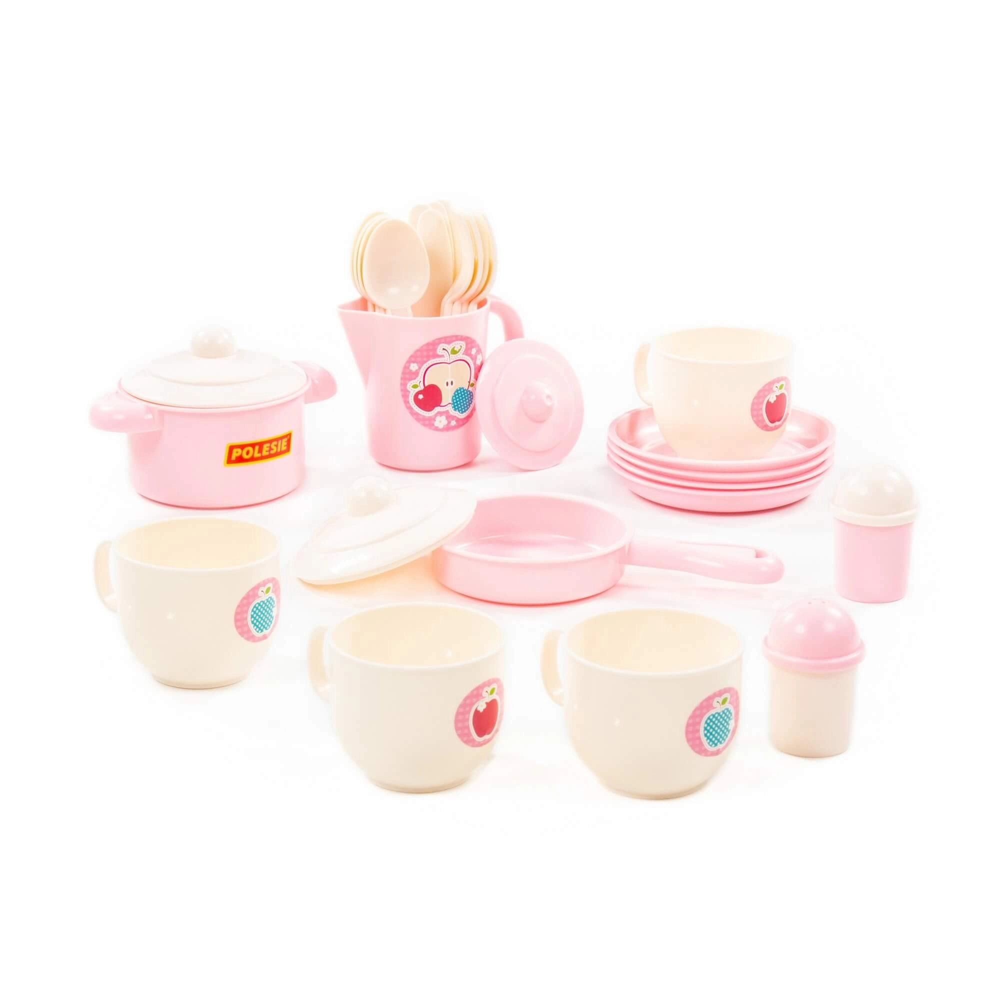 Teller, Tassen mit Untertassen, Topf und Pfanne mit Deckeln, Kännchen, Besteck und Gewürzstreuer – alles, was Kinder für realitätsnahes Koch- und Servierspiel brauchen.
