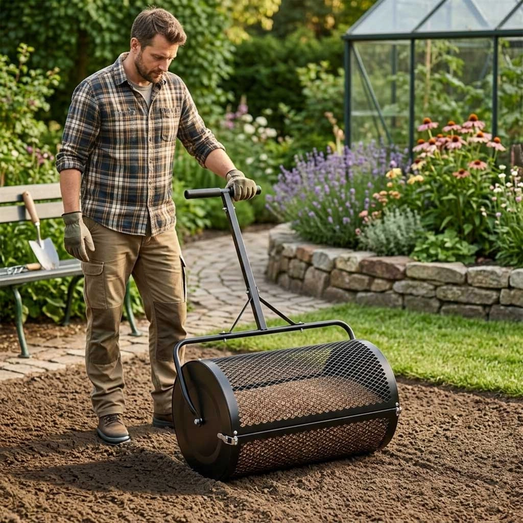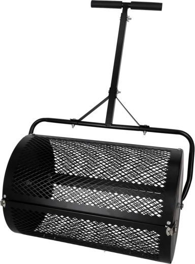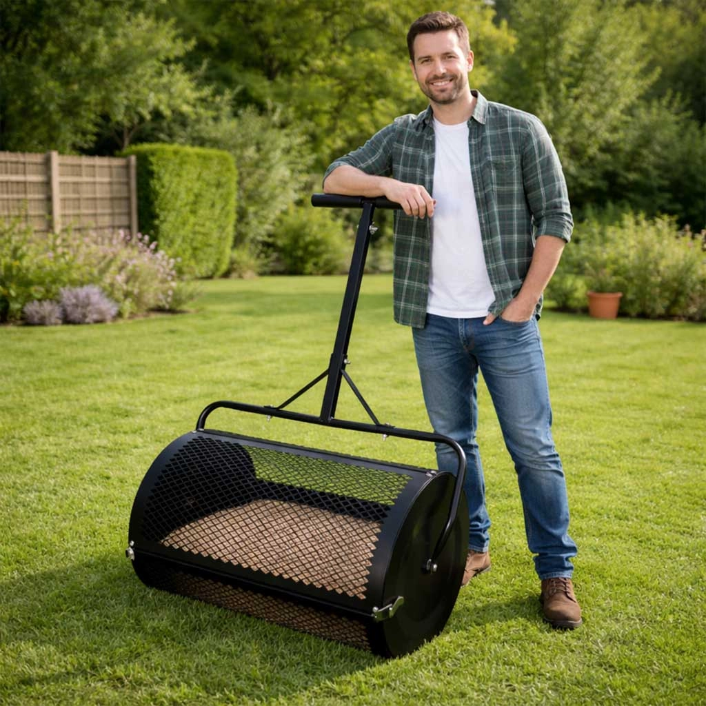 Der LUARO Kompoststreuer ist für die schnelle und effiziente Bearbeitung von Rasenflächen und Beeten konzipiert. Die drehbare Walze aus perforiertem Metallgitter mit Maschen von ca. 1 × 1 cm lässt Kompost, Torf, Sand oder feine organische Dünger gleichmäßig hindurch und minimiert Materialklumpen. Der stabile Rahmen mit T‑Griff ermöglicht komfortables Schieben vorwärts und rückwärts sowie eine präzise Dosierkontrolle.