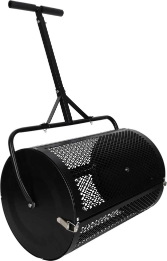Die perforierte Trommel mit Maschen von ca. 1 × 1 cm siebt und dosiert das Material fein, was eine homogene Abdeckung von Rasen und Beeten gewährleistet.
