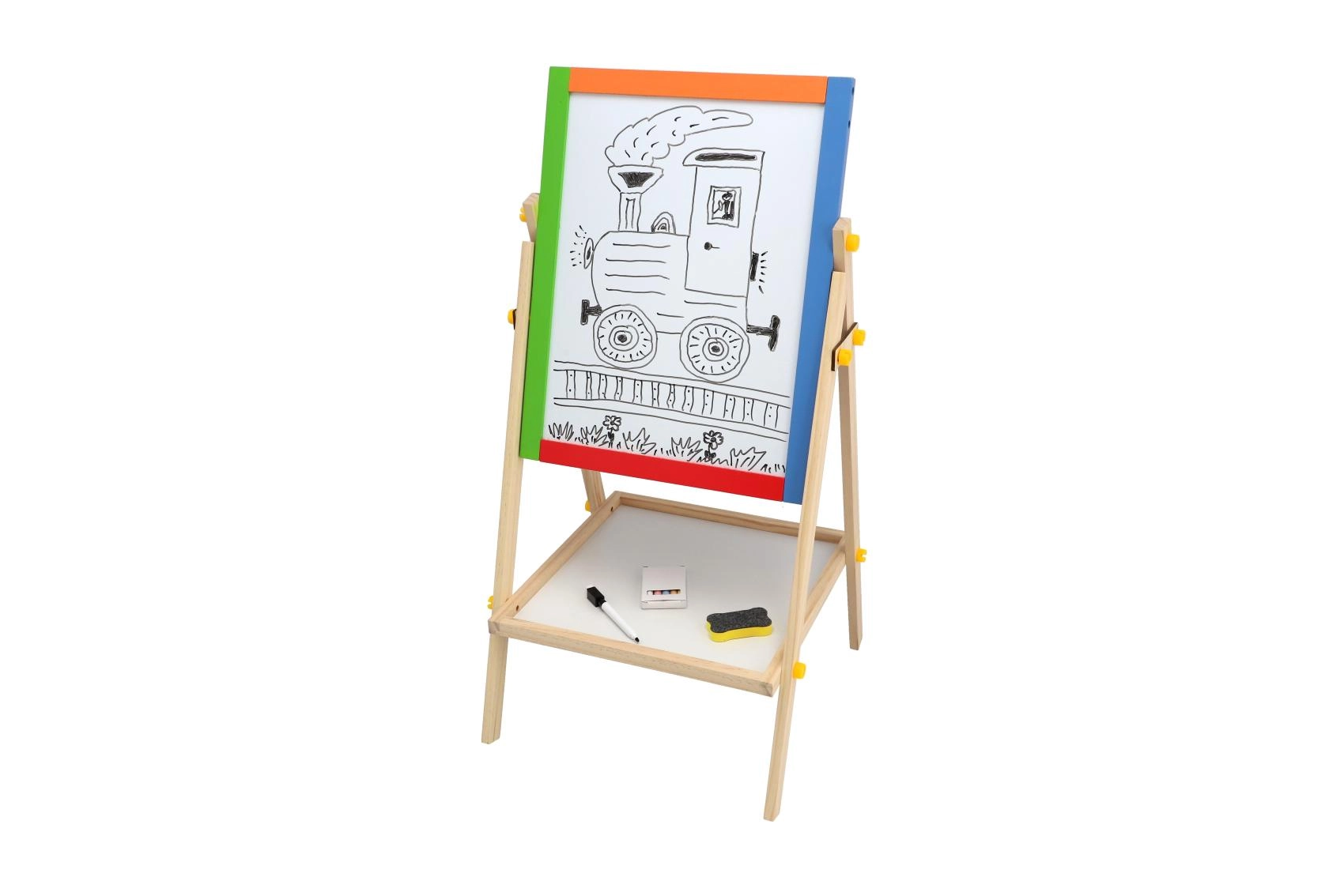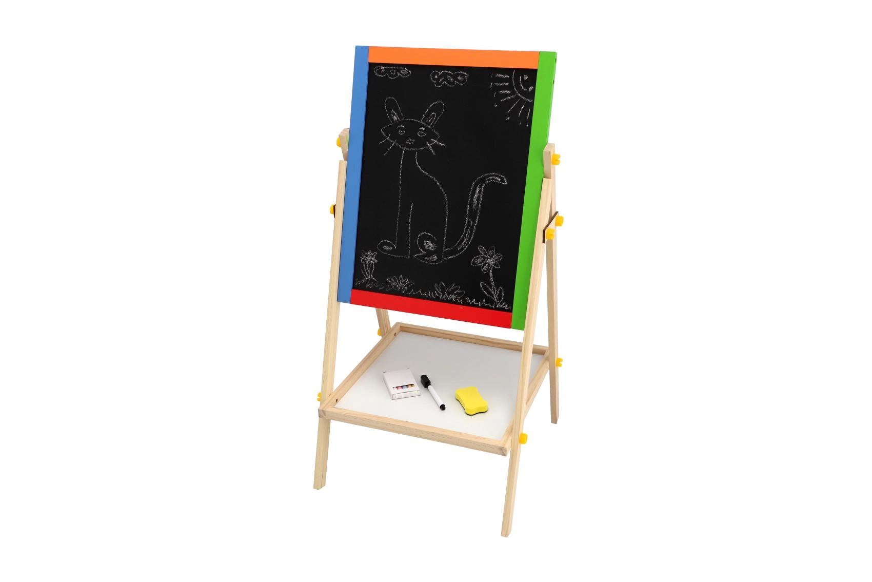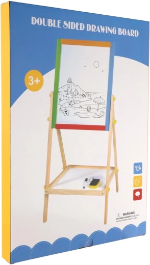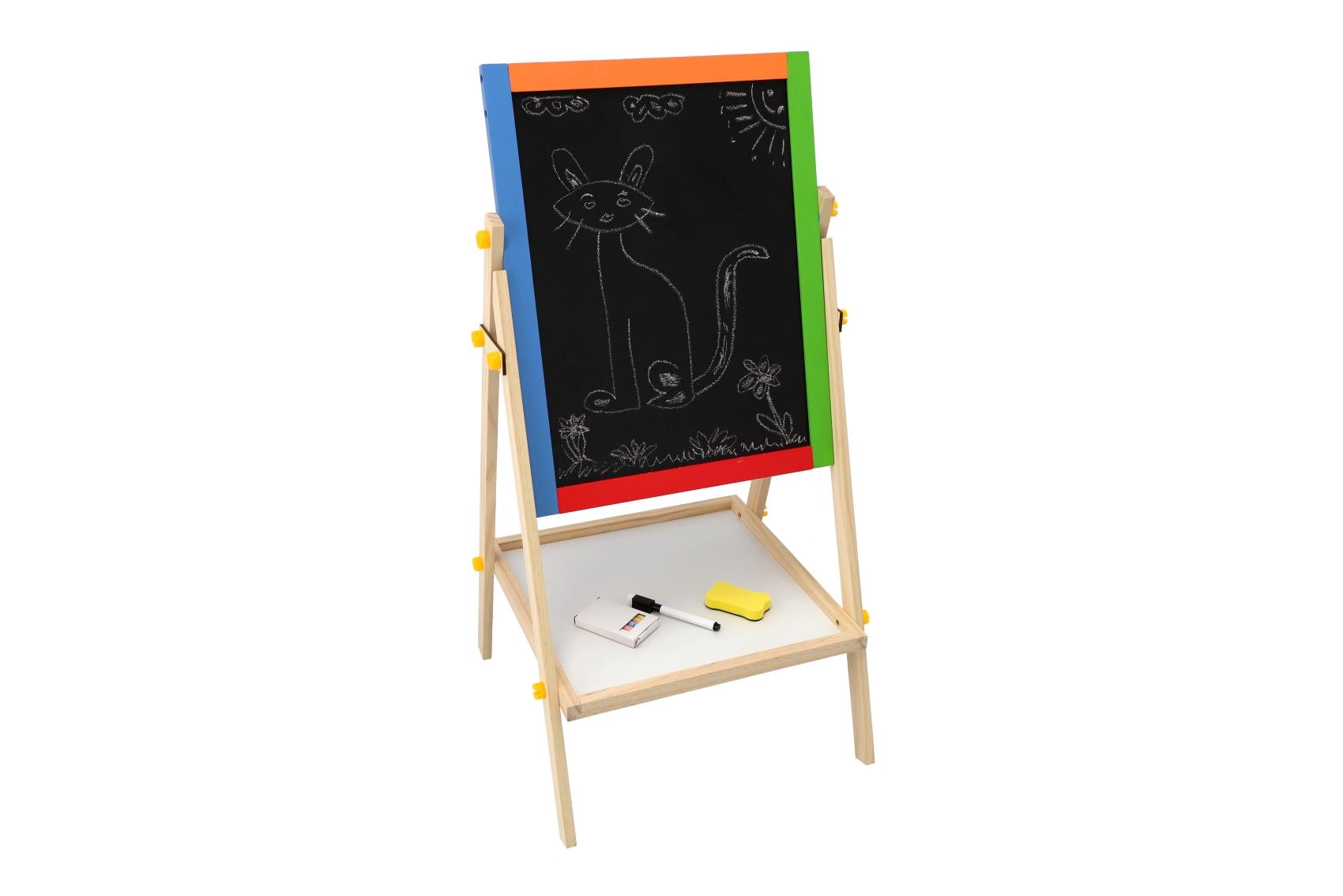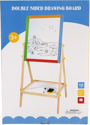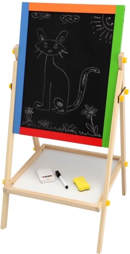 Diese beidseitige Tafel fördert Kreativität, Feinmotorik und erste schulische Fähigkeiten. Kinder können zwischen Kreidezeichnen und Schreiben mit dem Marker wechseln, Buchstaben mit Magneten lernen und das Rechnen üben – alles an einem Ort.