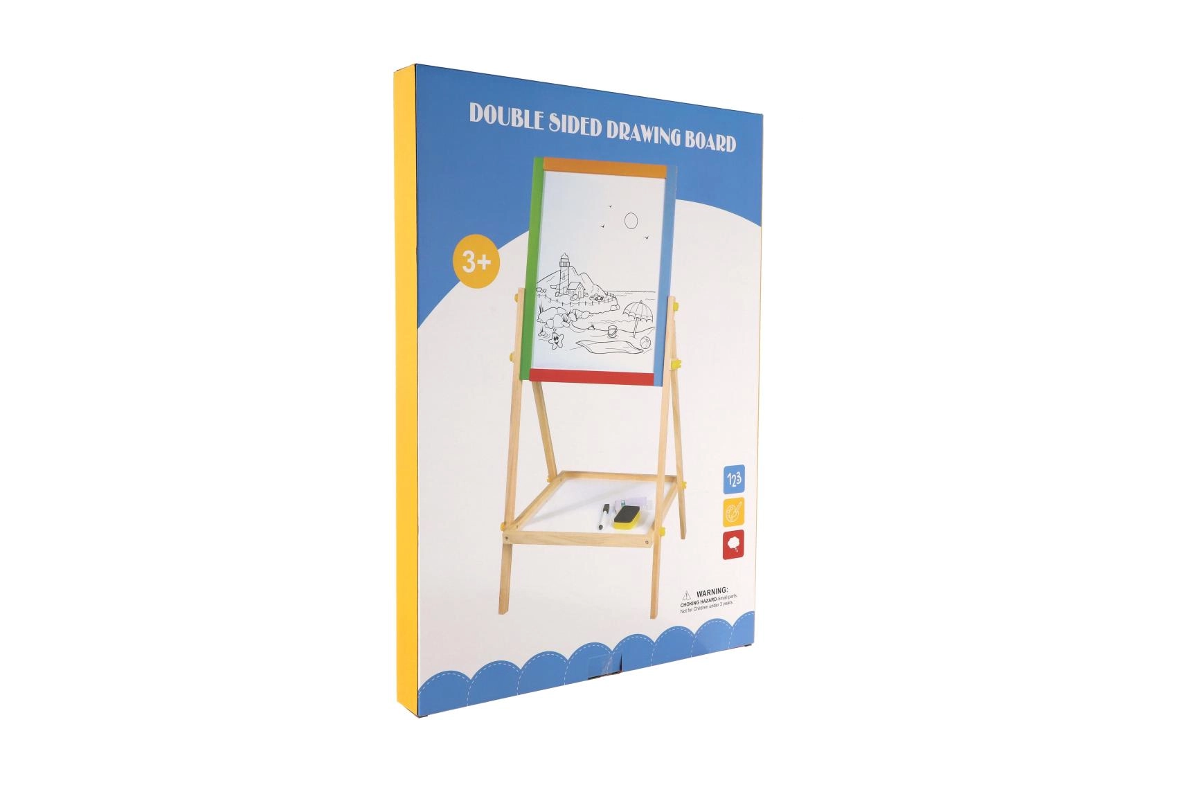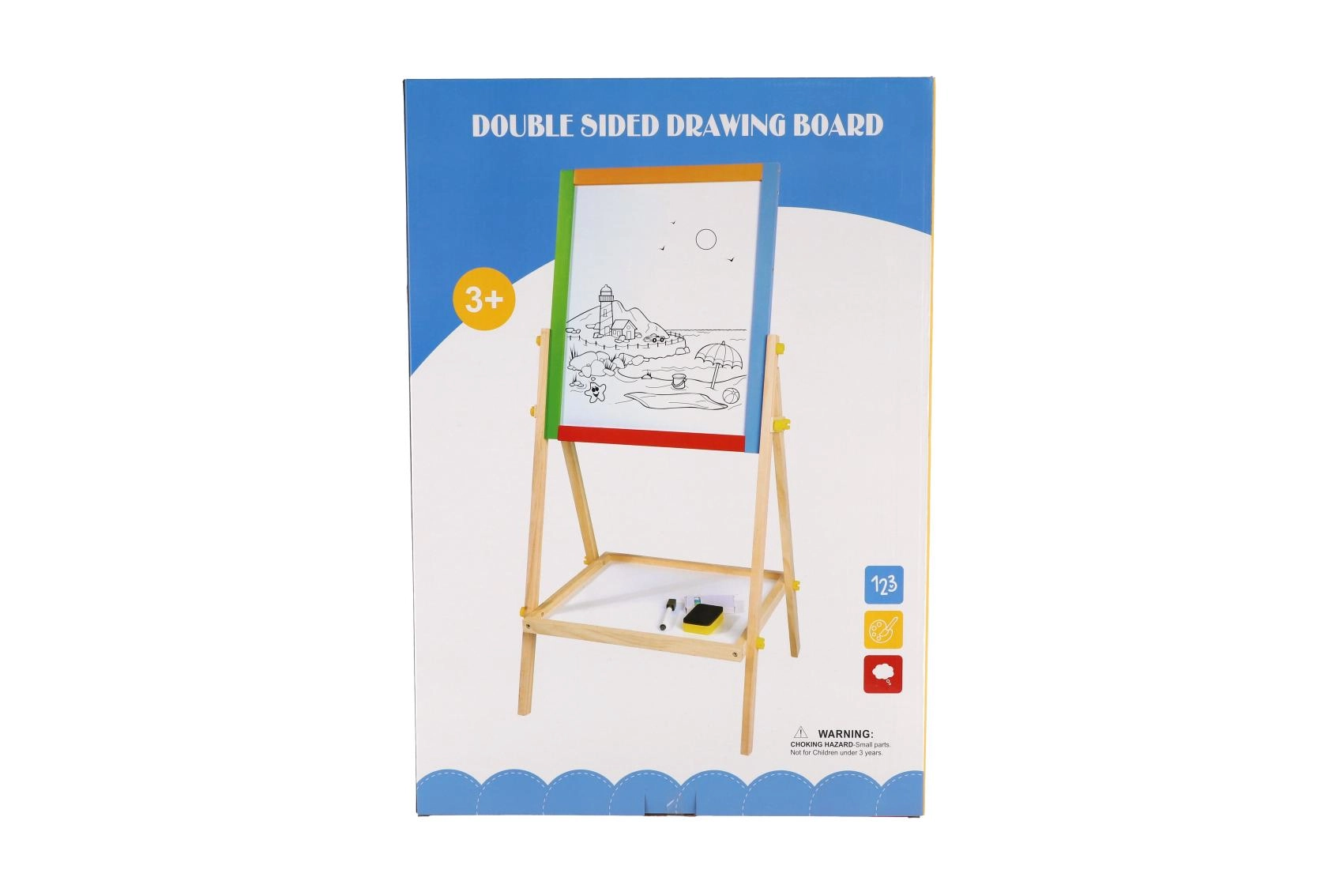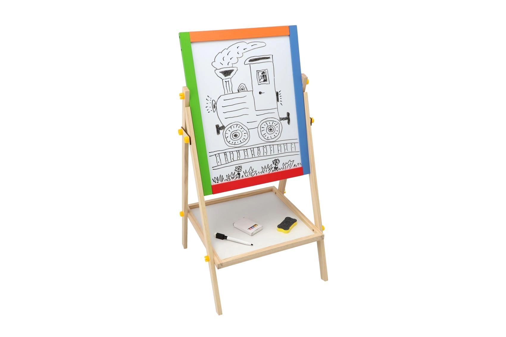 Diese beidseitige Tafel fördert Kreativität, Feinmotorik und erste schulische Fähigkeiten. Kinder können zwischen Kreidezeichnen und Schreiben mit dem Marker wechseln, Buchstaben mit Magneten lernen und das Rechnen üben – alles an einem Ort.