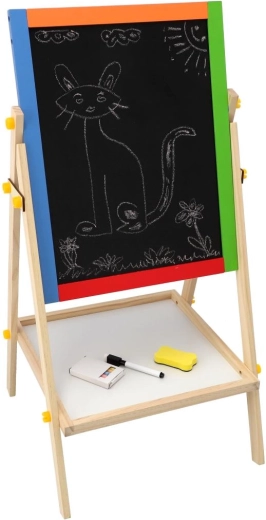Die robuste Holzkonstruktion ist stabil und sicher, während das praktische Ablagefach Kreiden, Marker und Wischer stets griffbereit hält. Dank der kompakten Maße von 35 × 43 cm ist die Tafel ideal für Kinderzimmer und Spielräume.