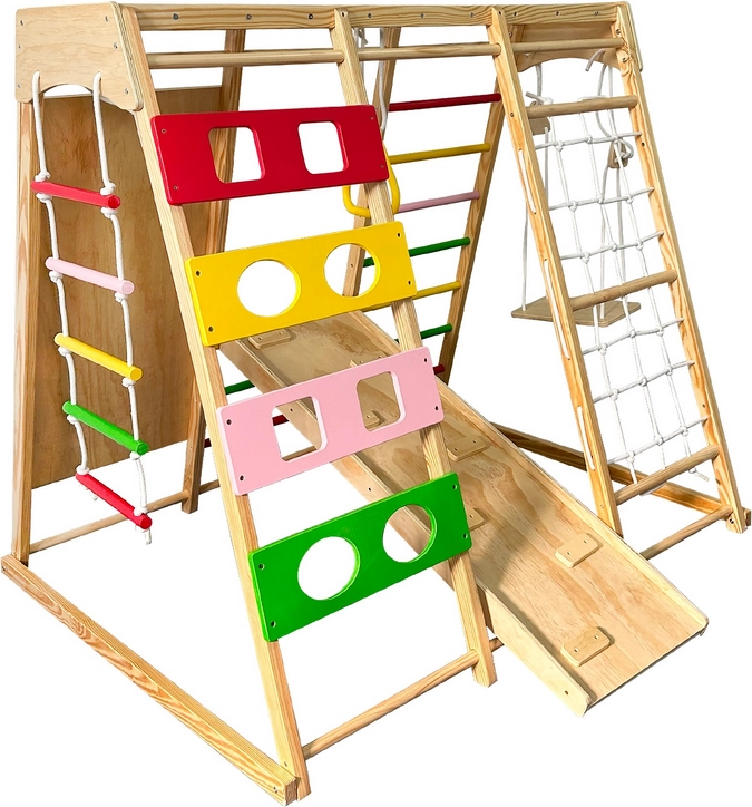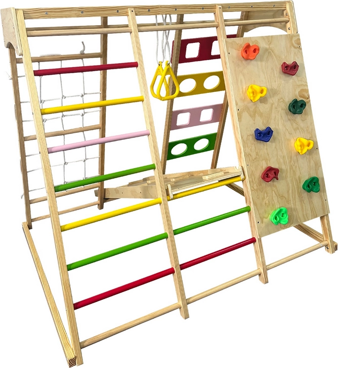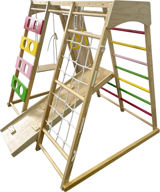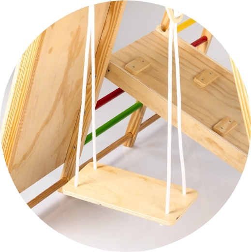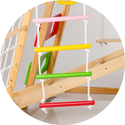 Dieses robuste Indoor-Klettergerüst aus Massivholz bietet Kindern eine vielfältige Palette an Aktivitäten an einem Ort. Dank der stabilen Konstruktion und abgerundeten Kanten ermöglicht es sicheres Klettern, Hangeln, Rutschen und Hängen. Mehrere Spielelemente in einem Set sparen Platz und motivieren Kinder zu natürlicher Bewegung jeden Tag.