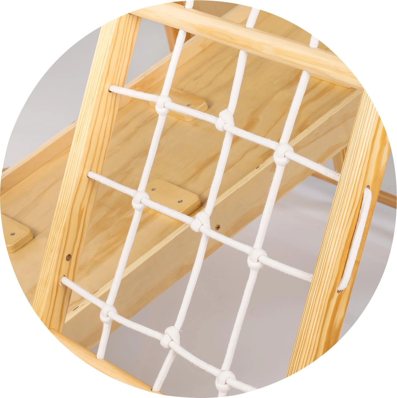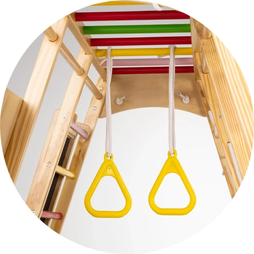 Das Kletternetz und die hängenden Ringe fördern Gleichgewicht, Koordination sowie den Oberkörper. Ideal für Hängen, Schaukeln und einfache Turnübungen.