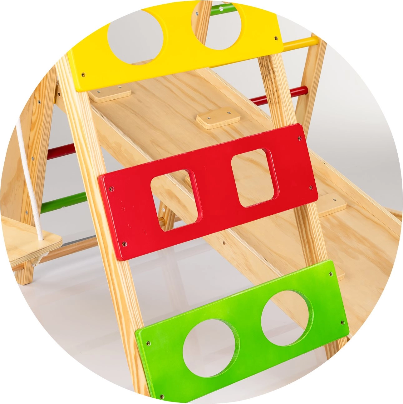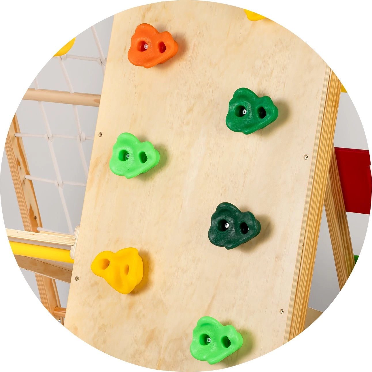 Farbige Klettergriffe unterstützen sicheres Bewegen und die Griffkraft. Das Brett kann als Rutsche oder Kletterrampe verwendet werden und sorgt für abwechslungsreichen Spielspaß.