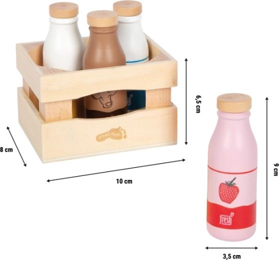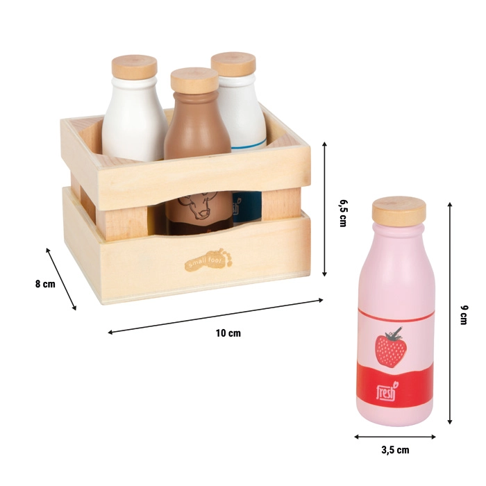 Dieses Holz-Set für Kaufladen und Kinderküche bringt einen realistischen Aspekt ins tägliche Spiel. Kinder können Kommunikation üben, soziale Fähigkeiten entwickeln und ihre Fantasie entfalten – beim Servieren von Getränken, Einkaufen oder Zubereiten des Frühstücks. Die Flaschen mit hölzernen Schraubverschlüssen liegen gut in kleinen Kinderhänden und überzeugen durch eine robuste Verarbeitung.