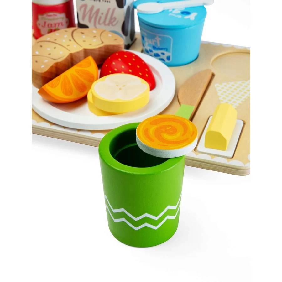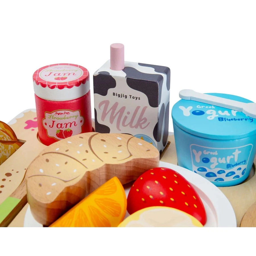 Dieses durchdachte Set enthält übersichtlich angeordnete Lebensmittel, Getränke und Zubehör auf einem stabilen Holztablett, damit Kinder einfach das Sortieren, Servieren und Organisieren üben können. Realistische Elemente und farbenfrohe Details laden zu fantasievollen Geschichten ein – vom Frühstück im Bett bis zum kleinen Café oder Zimmerservice.