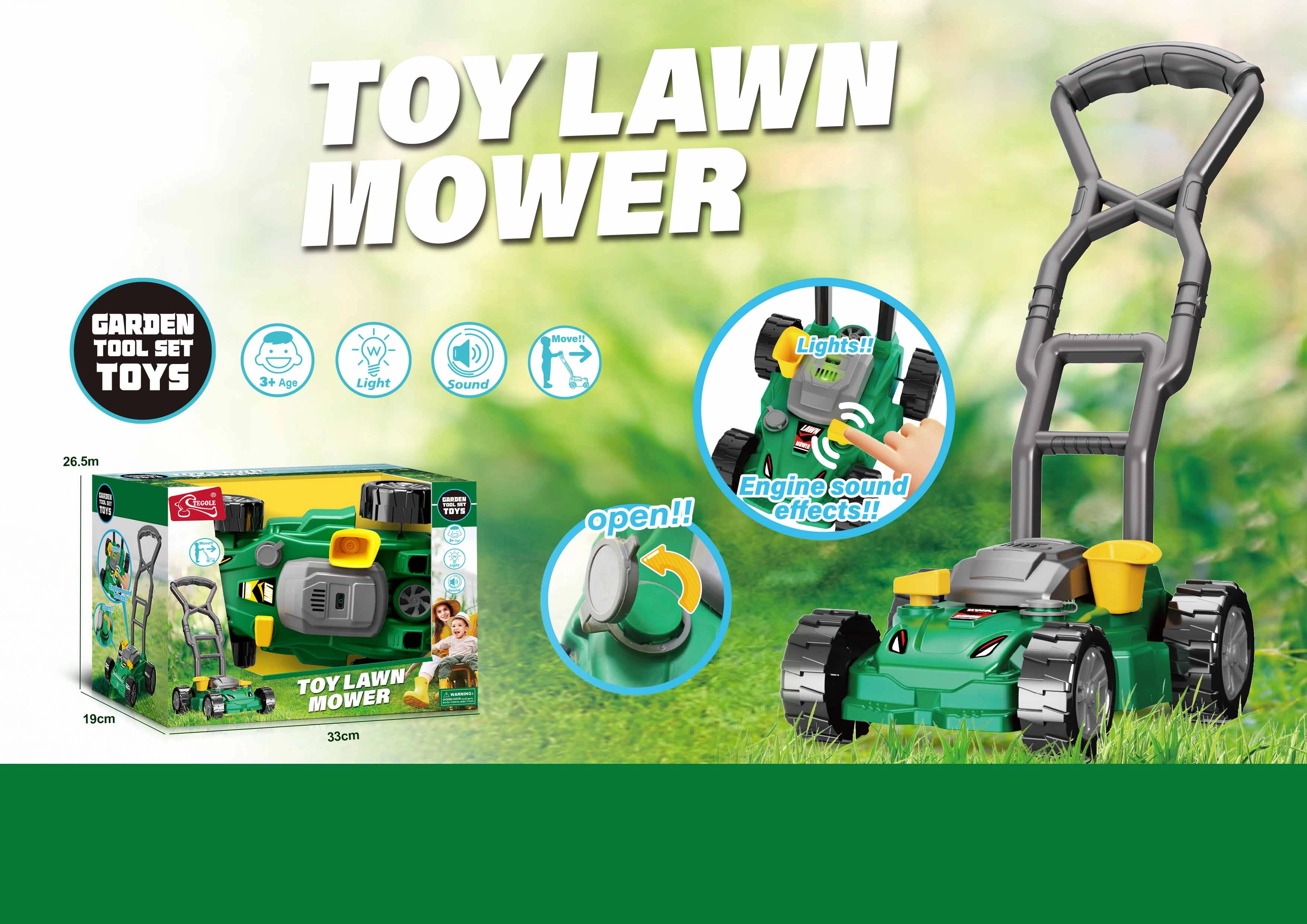 Dieser Kinder-Rasenmäher ist ideal für kleine Helfer, die Erwachsene bei der Gartenarbeit nachahmen möchten. Dank der Licht- und Soundeffekte wirkt das Spiel realistischer, und Kinder haben viel Spaß in Bewegung.