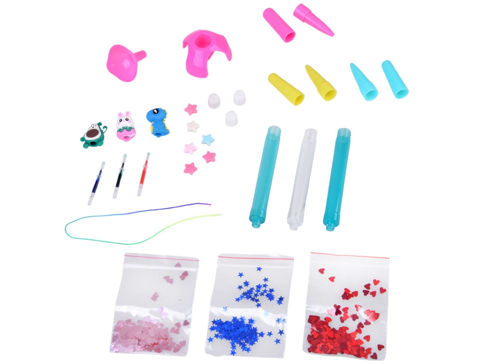 Mach aus dem Schreiben ein Vergnügen! Das praktische und verspielte DIY-Set zur Herstellung von Gelstiften ermöglicht es dir, das transparente Stiftgehäuse mit Wasser, Glitzer, Sternchen und Perlen zu füllen und mit einem niedlichen Topper zu ergänzen. Jeder Stift ist ein Unikat – wähle die Minenfarbe, mixe die Deko und kreiere deinen eigenen Stil.