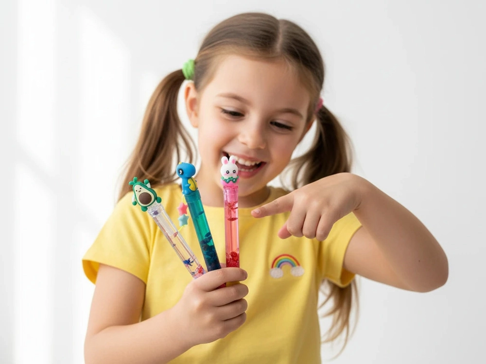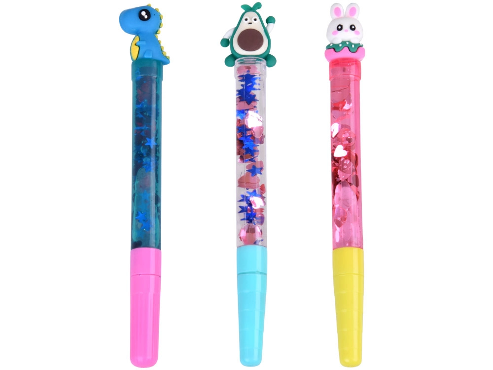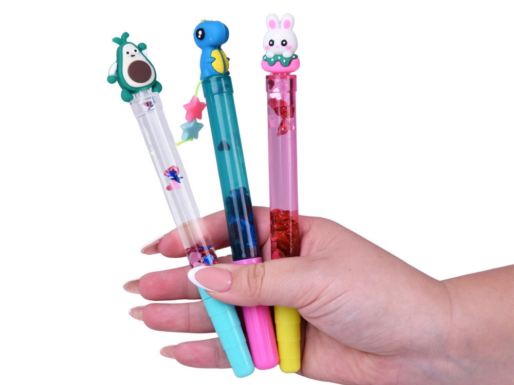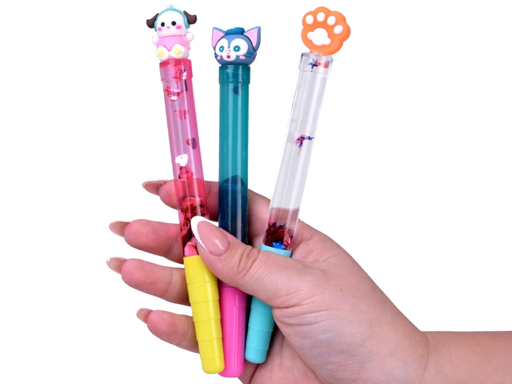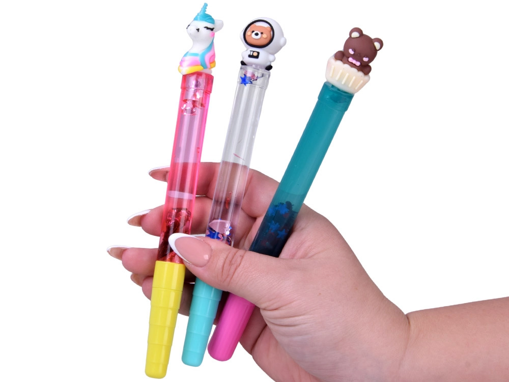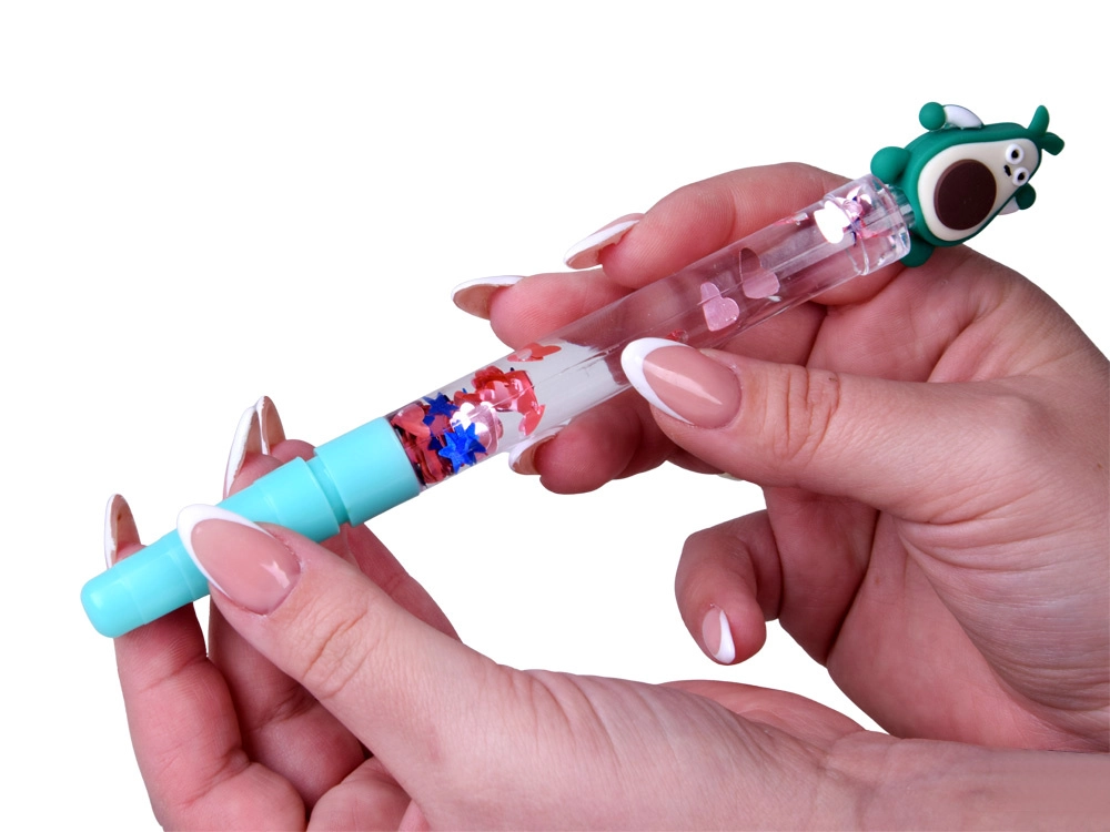 Das transparente Gehäuse mit Wasser und Glitzer erzeugt bei jeder Bewegung des Stifts einen bezaubernden Effekt schwimmender Formen.