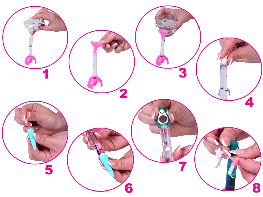 Befüllen, mit dem Trichter Wasser nachgießen, mit dem Gummistopfen verschließen, Mine einsetzen und mit einem Topper verzieren – einfaches und sauberes Basteln für Kinder.