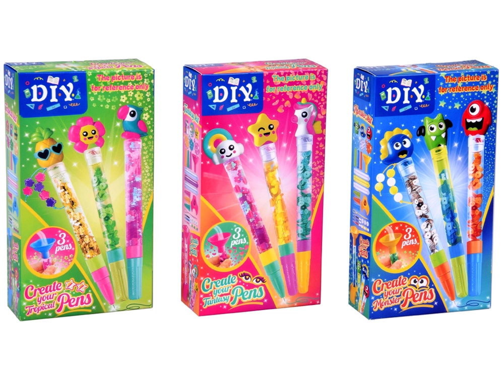 Der Inhalt reicht für drei komplette Gelstifte mit transparentem Gehäuse, Glitzer und farbigen Minen – jeder wird ein Unikat.