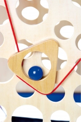 Der Stoffkorb zwischen den Wänden fängt heruntergefallene Kugeln auf, sodass nichts entwischt. Die sanfte Führung der Schnüre ist für Kinder leicht und fördert Geduld.