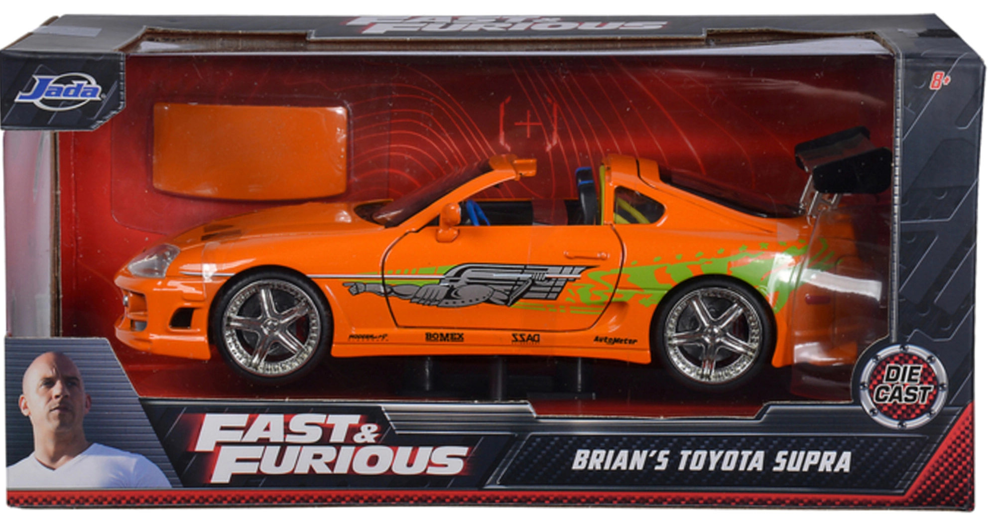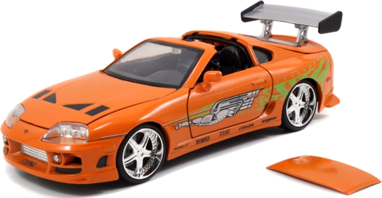 Erleben Sie den Adrenalinkick der Serie Fast & Furious mit der präzisen Replik der Toyota Supra von Jada Toys. Das Modell im Maßstab ca. 19 cm bietet eine Karosserie aus Metall, öffnende Türen und Kofferraumdeckel sowie eine detailreiche Ausführung in ikonischem Orange – perfekt für Sammler und Fans schneller Autos.