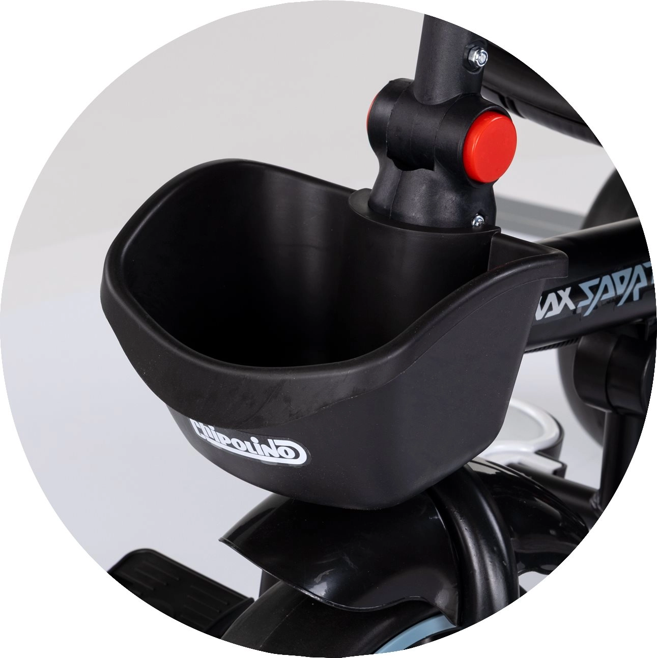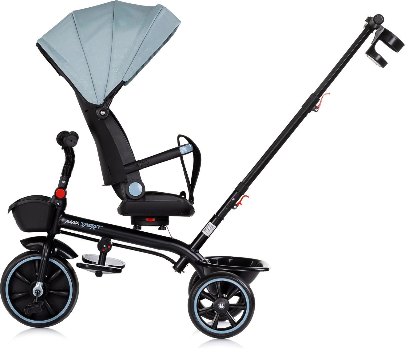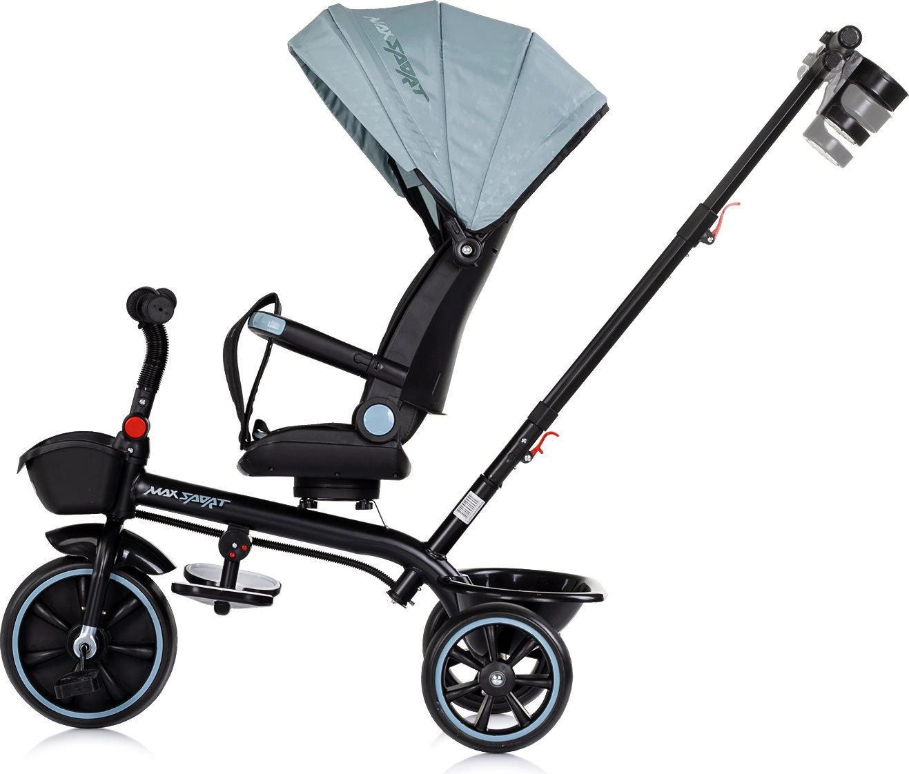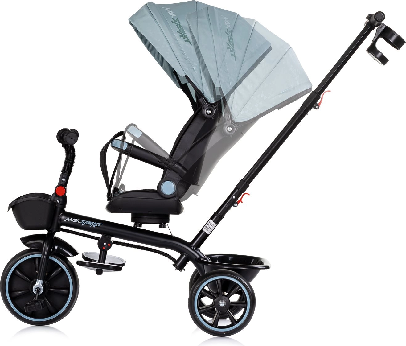 Für sonnige Tage gibt es ein klappbares Verdeck mit Sonnenschutz, die klapp- und bewegliche Fußstütze unterstützt die Erholung kleinerer Kinder. Die praktische Ausstattung umfasst einen Flaschenhalter mit Befestigung in zwei Positionen sowie Aufbewahrungskörbe vorne und hinten für Kleinigkeiten. Abnehmbare Teile (Verdeck, Schiebegriff, Stoßfänger) ermöglichen die einfache Umwandlung in ein Dreirad für größere Kinder.